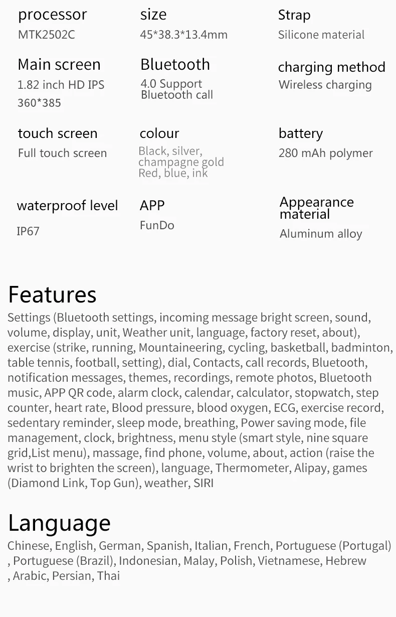 Язык часов: Китайский/английский/немецкий/испанский/итальянский/Французский/Португальский (Португалия)/португальский