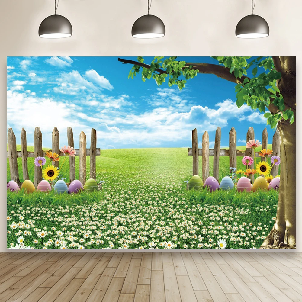 Виниловый фон для фотосъемки новорожденных с изображением весенних цветов Пасхи зеленой лужайки голубого неба