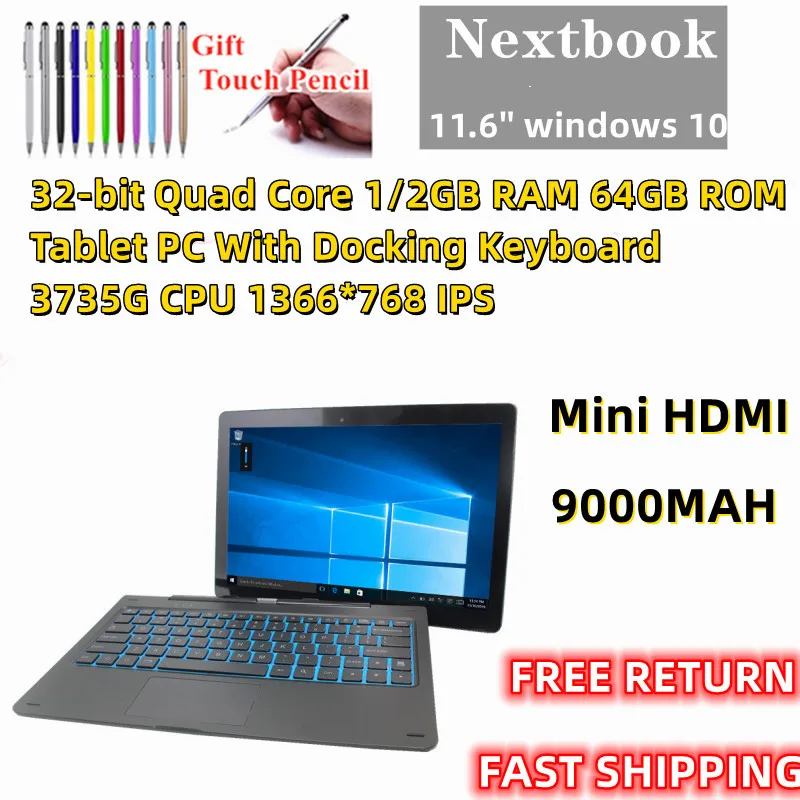 Технические характеристикиОсновная информацияБренд «nextbook»-это текущий логотип на ПК. Это OEM планшетный ПК, мы продаем его по заводской цене. Нет официального сертификата авторизации!Если вы не можете принять, пожалуйста, не покупайте!Если вам нужен логотип нашей компании «Glavey», кроме того, пожалуйста, оставьте сообщение во время покупки!Любой спор или возврат на логотип или поддельные проблемы не приемлемы! Вы покупаете это означает, что вы подтвердили все выше, Никаких споров!"Модель G12Тип планшетного ПКОперационная система Windows 10 HomeПроцессор: Intel (R) Atom (TM) 3735G CPU @ 1,44 GHzХранениеОперативная память 1/2 Гб DDRПЗУ 64 Гб флэш-памятиРасширительная карта TF до 128 Гб (не входит в комплект)ДисплейЭкран 11,6» ЖК-дисплей ЭкранТип экрана P + G COBРазрешение 1366*768 IPS 16:9, емкостный, 10 точек мультитачСетьПоддержка сети WiFiWIFI 802.11b/g/n беспроводной интернетBluetooth Да, BT 4,0МедиаформатыHDMI Yes, mini DHMI AV out jack 1080PАудио форматы MP3,WAV,WMAВидео форматы 1080P,3GP,MP4Форматы изображений BMP,GIF,JPEG,JPG,PNGФорматы электронных книг PDF,PowerPoint,TXT,WordФормат MS Office Excel,PPT,WordКамераТип камеры двойная камера sПередняя камера 2 Мп: задняя 2 МППодключениеСлот для карты TF даРазъем Micro USB ДаHDMI даХост USB ДаДа постоянного тока3,5 мм разъем для наушников: ДаЯзык s предустановленный язык: ОС Windows встроена на английском языке, и другие языки s должны быть загружены через Wi-Fi. ОС поддерживает несколько языковДополнительные функции: Bluetooth, браузер, калькулятор, система гравитационного зондирования, MP3,MP4,Wi-FiОбщийАккумулятор встроенный аккумулятор 3,7 V/9000mAhАдаптер переменного тока 100-240V 5V 2AGPS N/AПоддержка g-датчикаПоддержка SkypeПоддержка YoutubeПоддерживаемый динамикПоддержка МикрофонаПоддерживается магазин Google PlayРазмер: Таблица: 301*184*9,4 ммВес: Таблица: 778 г keyboad: 589 гПосылка включает в себя: