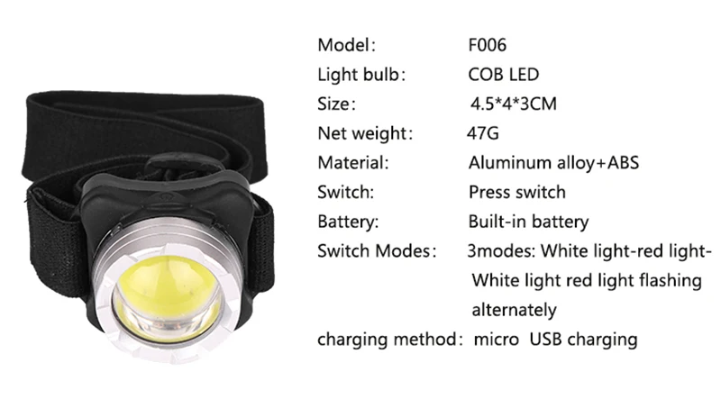 Встроенный аккумулятор продлевает срок службы фары, это очень удобно для вас, чтобы использовать его напрямую.Режим зарядки Micro USB, он будет полностью заряжен от любого usb-порта.