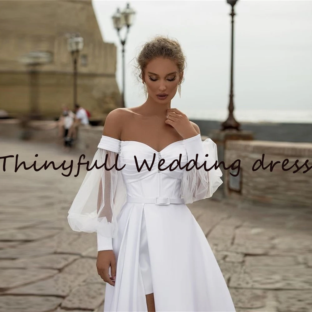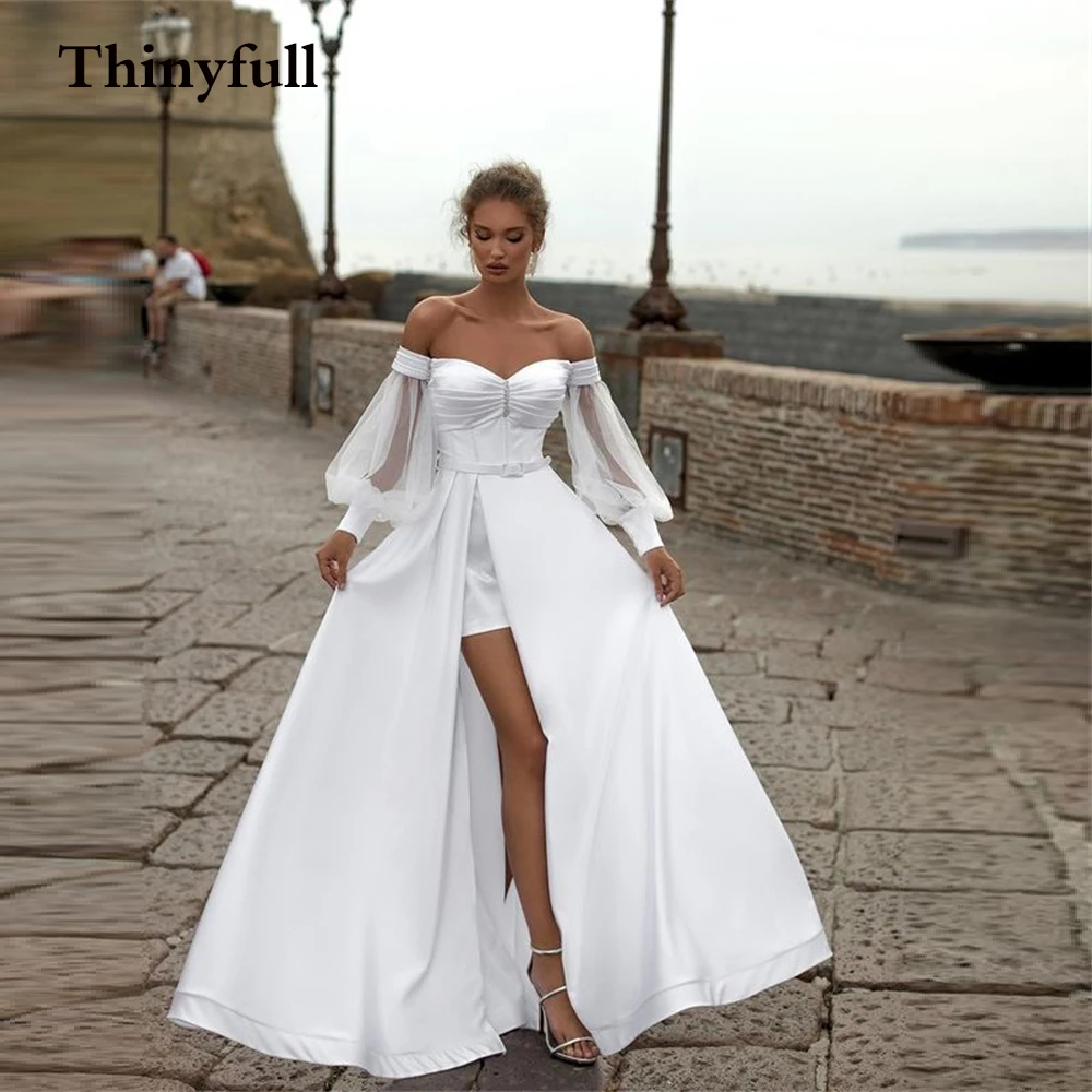 Thinyfull, Простые Свадебные платья с открытыми плечами и высоким Боковым Разрезом, новые пляжные свадебные платья с длинными рукавами, платье принцессы