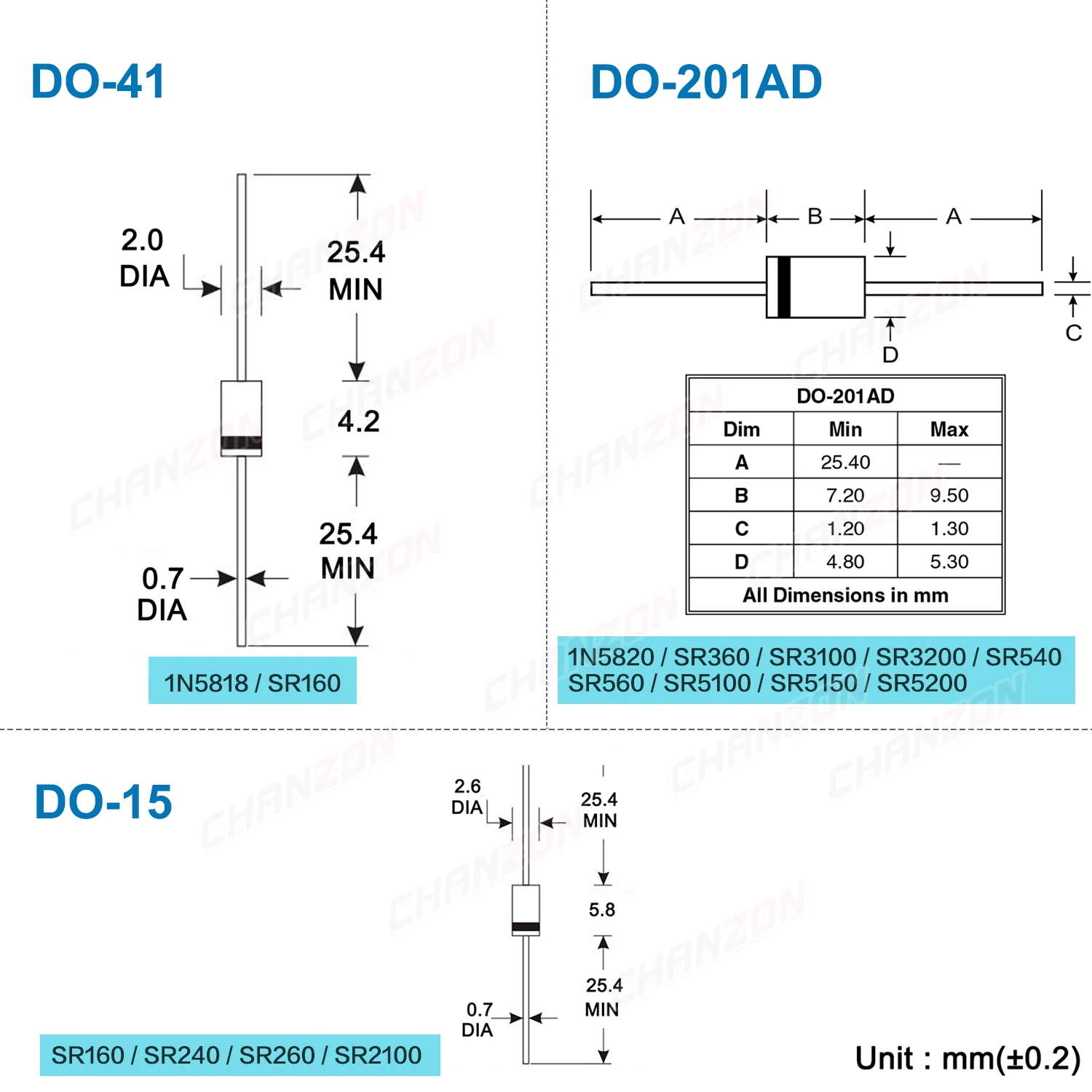 100 шт./упак.(1N5817,1N5818,1N5819,SR160,SR240,SR260,SR2100)20 шт./упак. (1N5820,1N5822,SR360,SR3100,SR3200,SR540,SR560,SR5100,SR5150,SR5200)Если вам нужна Таблица диодов, пожалуйста, свяжитесь с нами.