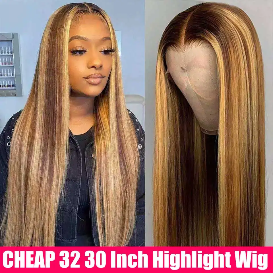 34 36 Inch Lace Front Wig Human Hair Straight Hair Hd Lace Frontal Wig Peruvian Colored Ombre Straight Highlight Wig Human Hair