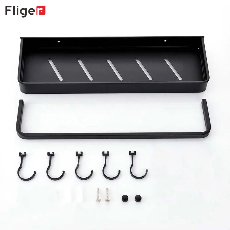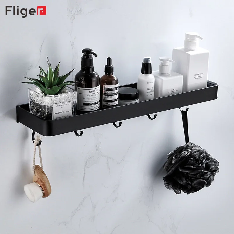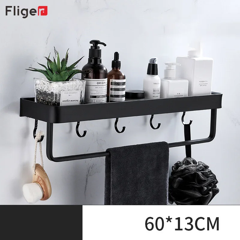 Fliger Черная полка для ванной Подставка для шампуня 304050 см Кухня Стеллаж для хранения полотенец Бар Халат Крючок Оборудование для ванной Пространство Алюминий
