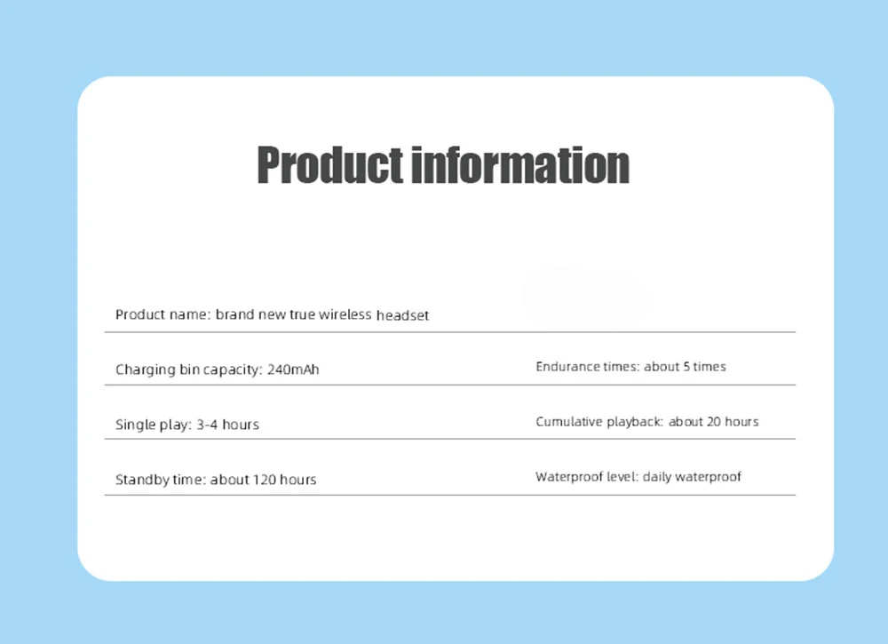 Описание:Это Беспроводная bluetooth-гарнитура i12PRO twsДизайн наушников, который подходит для ушной раковины человеческого тела для более прочной и удобной посадкиОдно касание, простота в эксплуатацииНовое обновление, чип Bluetooth 5,0Истинный беспроводной, отдельный двойной корпусКомпактный корпус, мини изысканныйИнтеллектуальное шумоподавление, умный дисплей батареиВысокое качество звука наушниковХарактеристики:Модель продукта: i12 PRO TWSВерсия Bluetooth: V5.0Аккумулятор для наушников: 50 мАчВремя работы в режиме ожидания: >100 часовВремя работы в разговорном режиме:> 4,5 часовПрослушивание песни: 4 часаБатарея: полимерная литиевая батарея, наушники 50 мА, зарядный отсек 300 мА · ч.Время зарядки: 40-50 минут для гарнитуры 1 час для зарядного отсекаУдобно носить, компактный и портативныйВысокое качество звукаНосимый во время занятий спортомВодонепроницаемый дизайнПосылка включает в себя:1 * bluetooth-гарнитура (L)1 * bluetooth-гарнитура (R)1 * зарядное устройство1 * кабель для передачи данных1 * Руководство пользователя