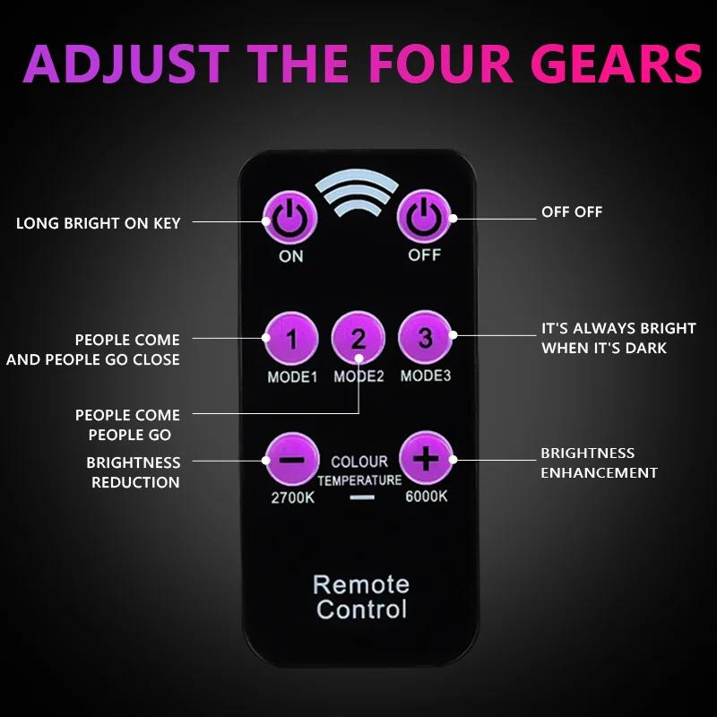 -Выключение: режим выключения, светодиодный светильник красного цвета;Режим 1: горит, когда люди проходят мимо, загорается, когда люди уходятРежим 2: горит, когда люди проходят мимо, 50% яркости, когда люди далекоРежим 3: автоматически светильник вверх при наступлении темноты, продолжайте до тех пор, пока не небо становится яркий-ВКЛ: всегда крепкий светильник