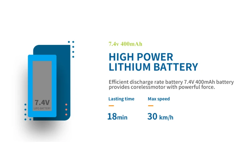 Эффективная разрядная батарея 7,4 В 400 мА · ч обеспечивает бескорпусный двигатель с мощной силой.Длительность: 18 мин.Максимальная скорость: 30 км/ч