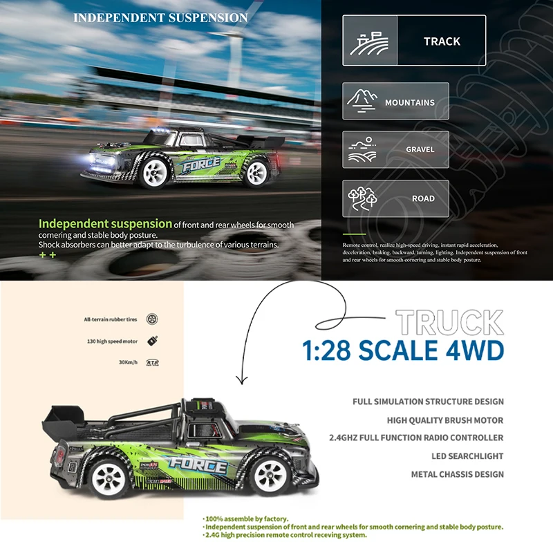 ● Название: 1:28 Электрический 4WD короткий грузовик● Размер: 17.5X 8X 5,5 см● Размер коробки: 24X19X 14,2 см●Mode: 2,4 ГГц (Управление расстояние: около 100 м)● Двигатель: 130 высокоскоростной двигатель● Батарея: 7,4 В 400 мАч● Максимальная скорость: 30 км/ч● Время использования: около 18 мин● Время зарядки: около 50 мин