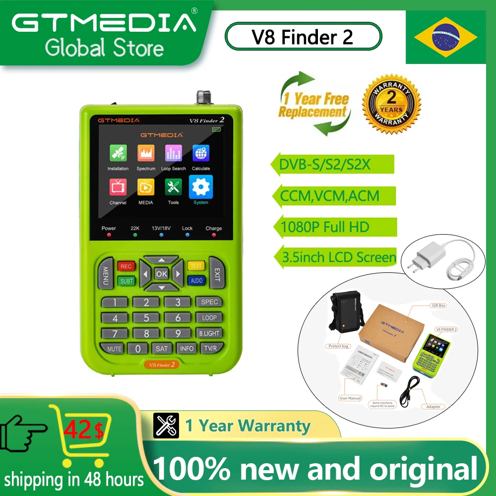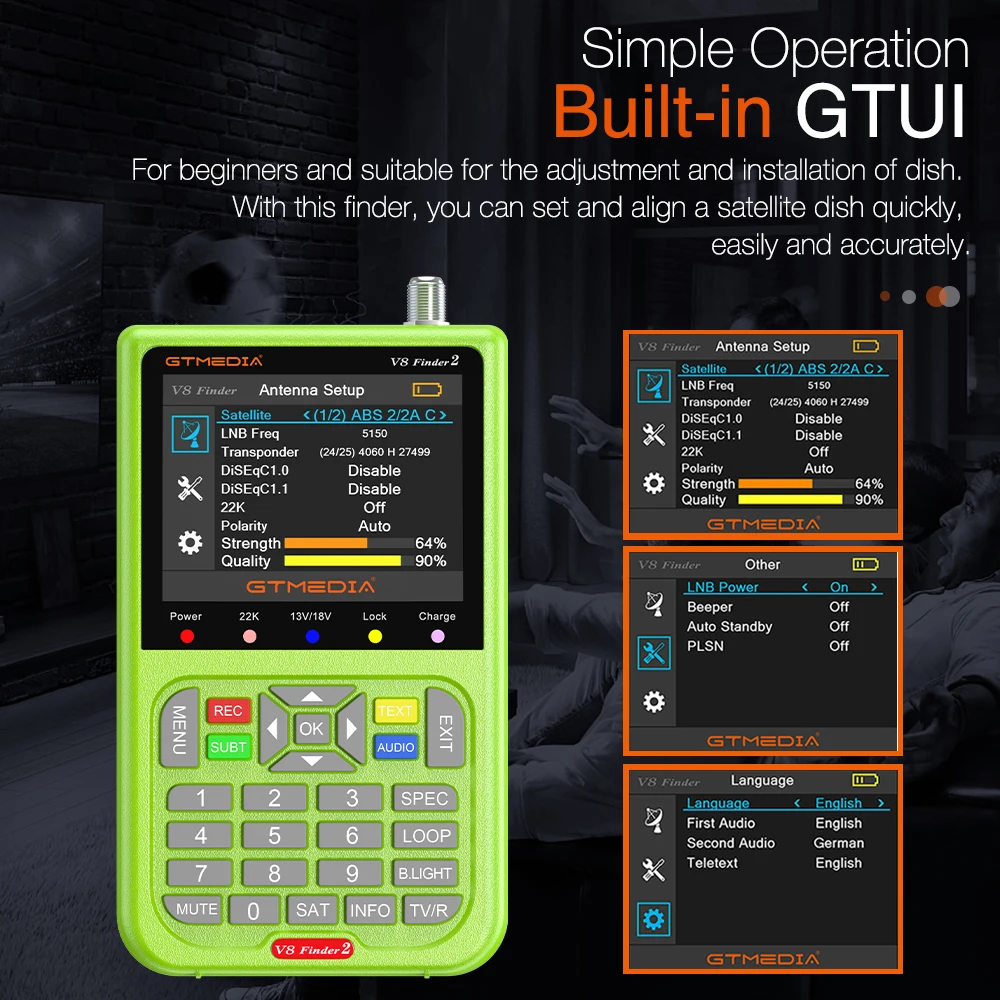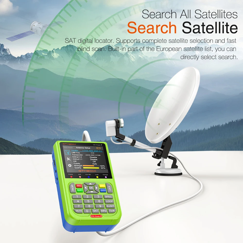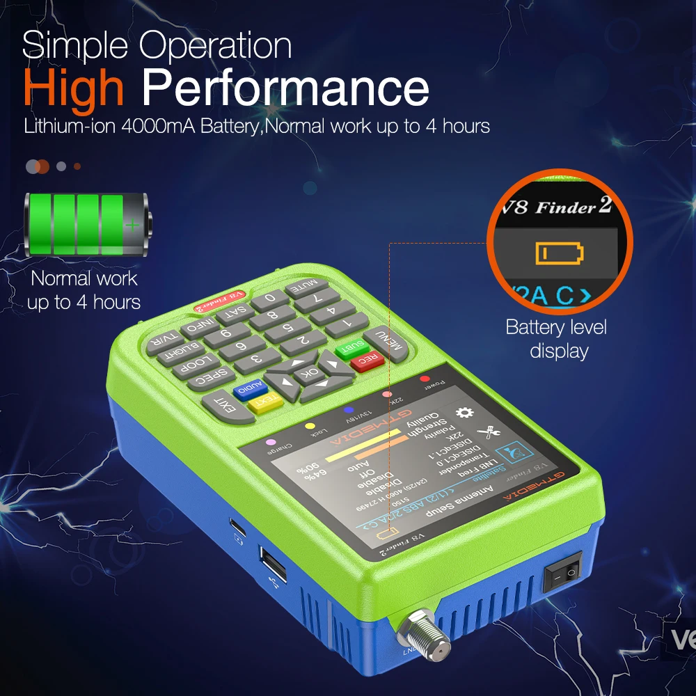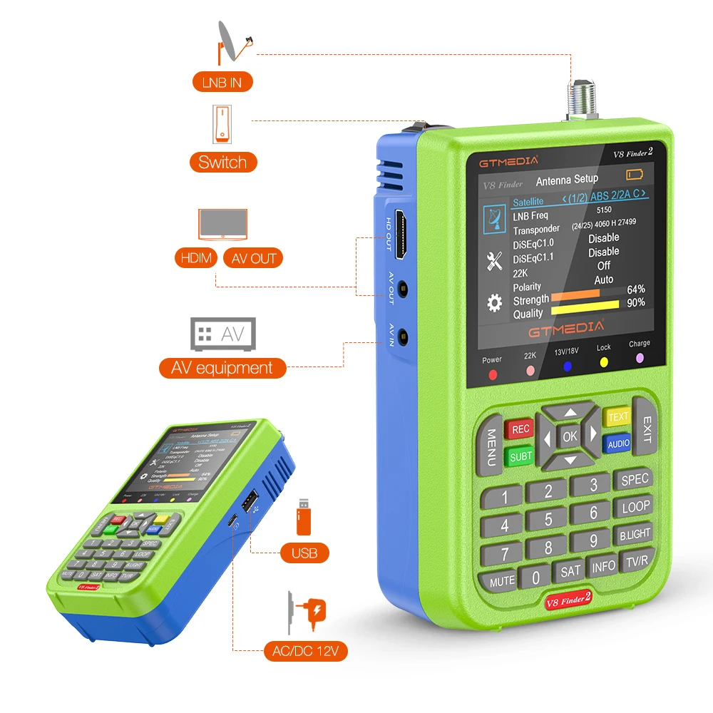 GTMEDIA V8 Finder2-это DVB-S/S2 и MPEG-2/4 H.264(8 бит) совместимый портативный спутниковый счетчик. Благодаря компактному размеру, легкому весу, интуитивно понятному интерфейсу пользователя, долгим часам работы батареи и богатым набором функций, счетчик предоставляет все функции, необходимые для установки и проверки цифрового спутникового ТВ-сервиса для жилых домов или многожилых единиц.