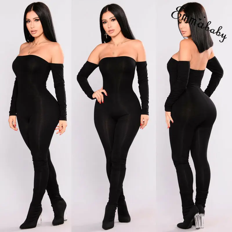 Женский Облегающий комбинезон с открытыми плечами, комбинезоны с длинным рукавом, обтягивающие сексуальные комбинезоны, женские черные брюки, клубная одежда