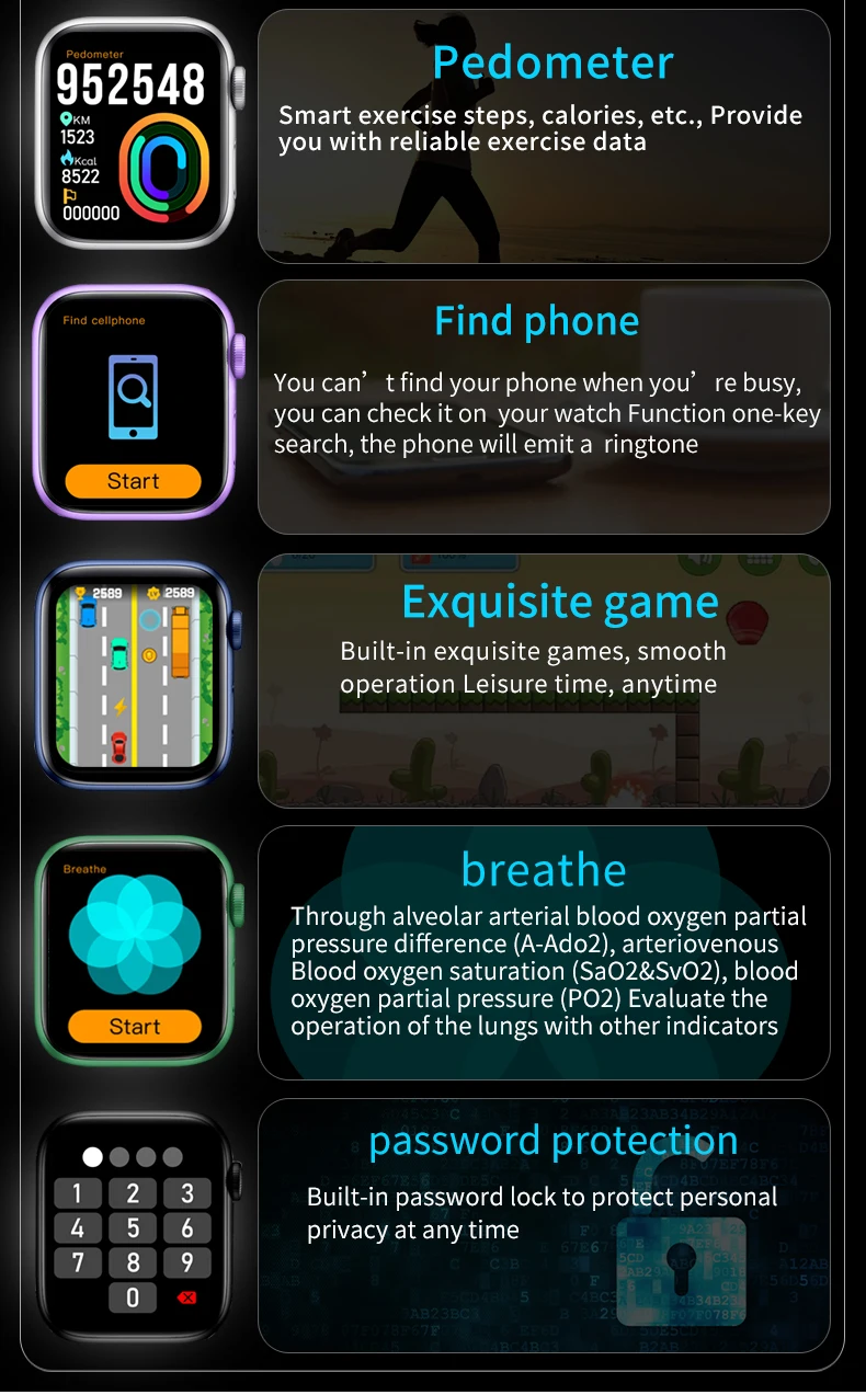 Поддержка 1,75 дюймовым экраном, вызовов через Bluetooth, сердечный ритм, измерять кровяное давление, оксиметр, Мути-режимы тренировок, обмен 44 мм, ремешок, прослушивание музыки через bluetooth, может таможенные циферблатов, разделенным экраном, 3UI, игровой контроллер погода, блокировка паролем.