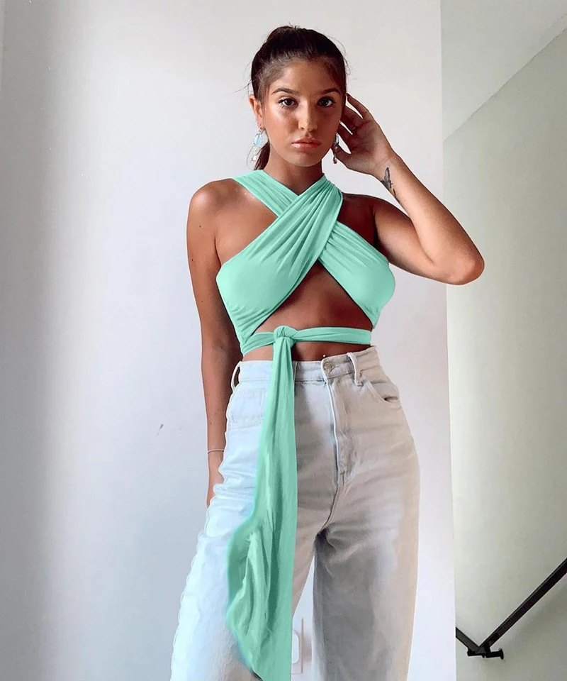 Кроп-Топ женский с лямкой через шею, модный бандажный Топ без рукав...