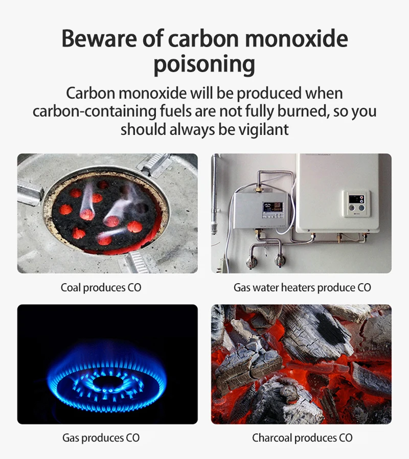4.CO уровень тревоги CO01A работающий от батареи сигнал окиси углерода запрограммирован для звуковой сигнализации при следующих концентрациях CO в течение указанных временных периодов:50 ppm в течение 60-90 минут,100 ppm в течение 10-40 минут и 300 ppm в течение 0-3 минут.При обнаружении CO и звуке будильника на ЖК-дисплее будет отображаться концентрация CO и будет гореть Синяя подсветка. Красный светодиодный индикатор мигнет, и будильник выдаст 4 коротких звуковых сигнала, повторяя цикл каждые 5 секунд.