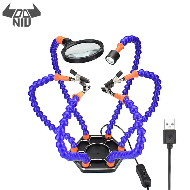 Особенности:1. Шесть маленьких гибких рук, вы можете легко положить руку в нужное положение. Это устраняет разочарование традиционных помощников.2. Металлические листы могут предотвратить скольжение на рабочем столе.3. Силиконовая пластина с зажимом типа крокодил, отличная термостойкость.4. Лупа USB 3X-5X поможет вам сделать лучше. Светодиодный USB светильник с переключателем, может отвечать различным условиям работы.5. Он очень подходит для сложной и сложной сварки, такой как обслуживание модели самолета, легко зажимать припой и работать.