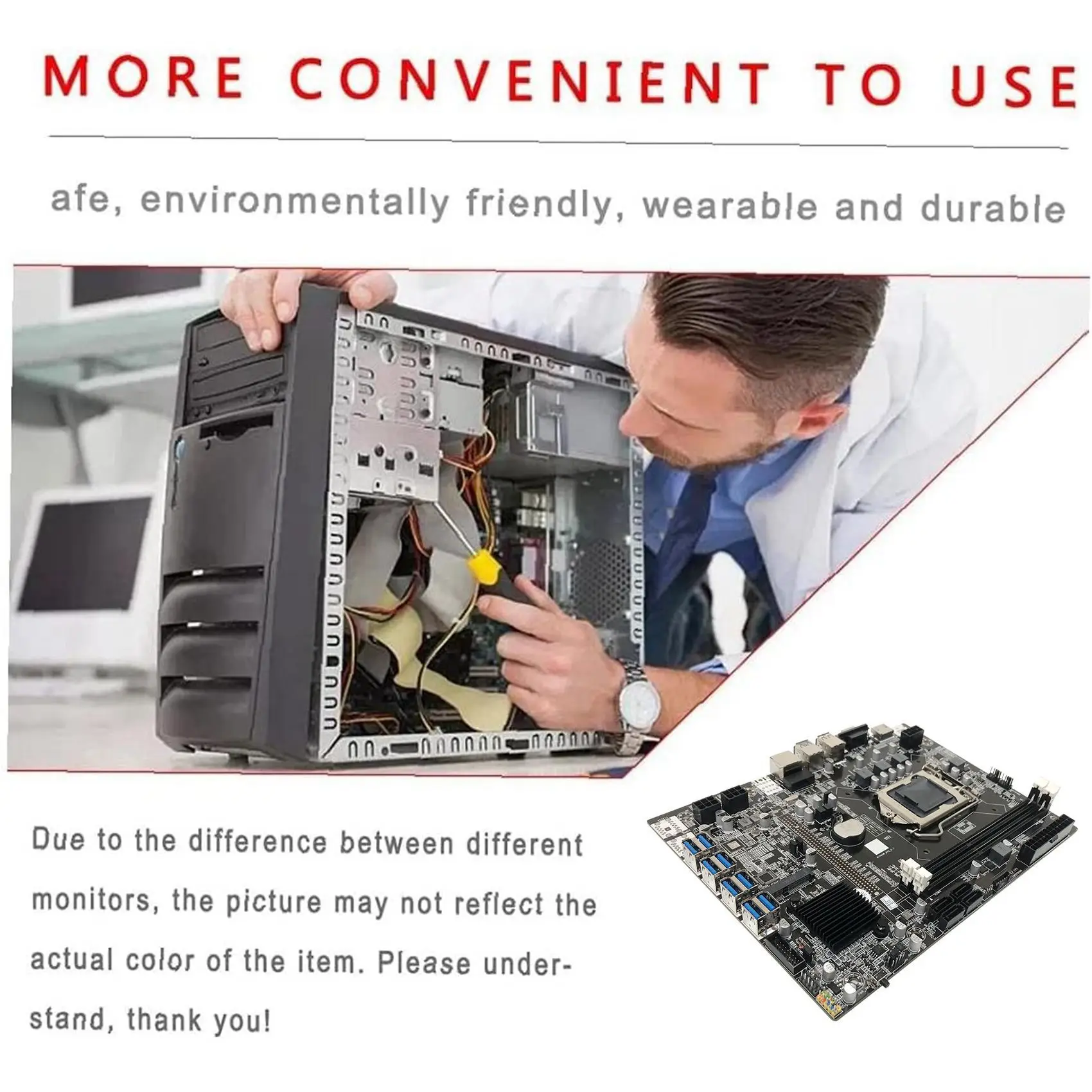 Материнская плата B75 USB-BTC использует цельные конденсаторы, чтобы сделать материнскую плату более стабильнойОн поддерживает ЦП LGA1155 и использует чипсет B75, чтобы обеспечить полную воспроизведение производительности ЦПМатеринская плата подходит для горнодобывающей промышленности благодаря низкой цене и богатым расширительным интерфейсам.(1) Интерфейс дисплея: 1 HDMI-совместимый, 1 VGA(2) USB задний: 2 x USB2.0(3) передняя часть USB: 1 x USB2.0(4) USB задний: 2 x USB3.0(5) передняя часть USB: 1 x USB3.0(6) интерфейс жесткого диска: 4 SATA(7) графический интерфейс: 8 x PCIE1X (USB передача)(8) интерфейс сетевой карты: 1 Сетевая карта LAN 100M(9) Слот памяти: 2 x DDR3(10) ЦП разъем: LGA (1155)(11) Чипсет: BGA (B75)(12) интерфейс жесткого диска: 1 MSATA(13) первоначальное восстановление BIOS: JCMOS(14) интерфейс динамика: 1SPK(15) интерфейс питания: 24pin_ATXPWR(16) интерфейс питания: 4pin_ATX12VМаксимальная емкость памяти: поддержка в общей сложности 16 г, один максимум 8 гОписание памяти: Поддержка частоты 1333/1600 МГцНабор микросхем: для микросхем Intel B75 ExpressАудио чип: N/AЧип сетевой карты: 1 сетевая карта REALTEK 100MВнешний вид и цвет различных партий продуктов могут отличаться, что не повлияет на использованиеЦвет: черныйМатериал: PCBРазмер: 230,32 мм x 174,92 ммПосылка:1 х материнская плата1 x процессор G5402 x SATA кабеля (цвет и внешний вид случайный, не принимаем указанные)Только вышеуказанная посылка, другие товары не включены.Примечание: светильник и различные дисплеи могут привести к тому, что цвет товара на картинке немного отличается от реального. Допускается погрешность в измерениях +/- 1-3 см.
