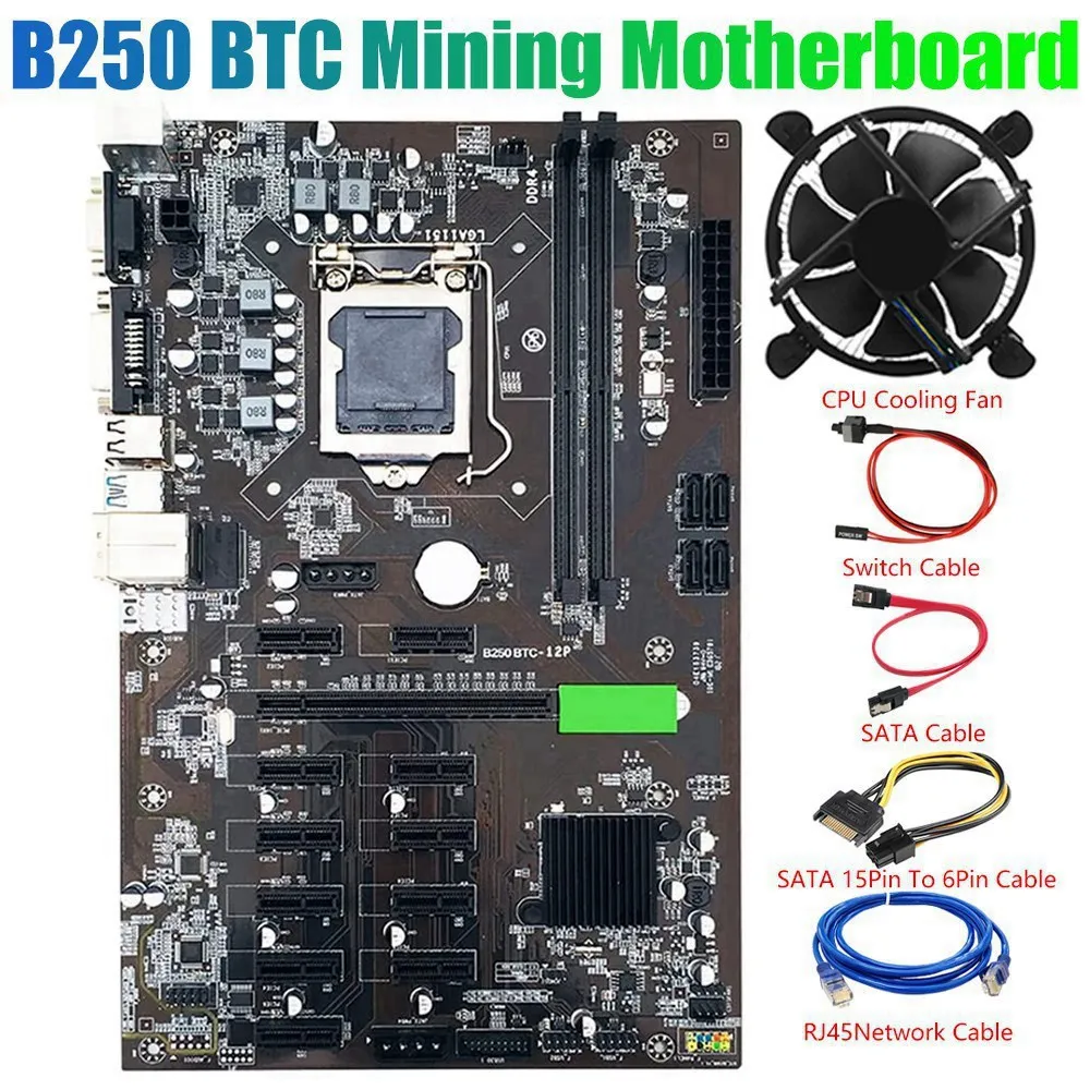 Материнская плата B250 BTC с охлаждающим вентилятором и кабелем SATA, 12 GPU LGA1151 DDR4 SATA 3,0 USB 3,0 для майнинга биткоинов ETH Miner