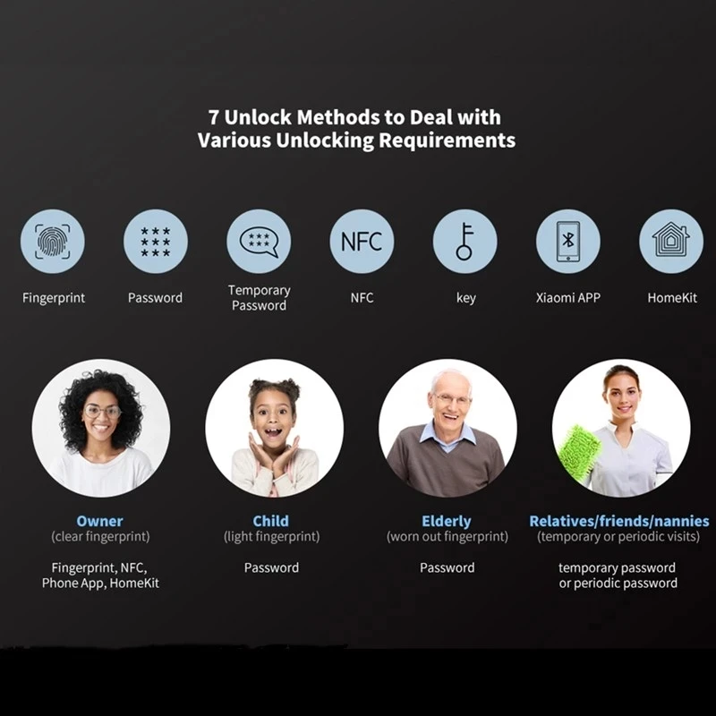Разблокировка с отпечатком пальца, паролем, временным паролем, механическим ключом, NFC (поддерживается только Xiaomi phone, Mi band 4, последние часы), мобильный телефон Bluetooth, HomeKit.