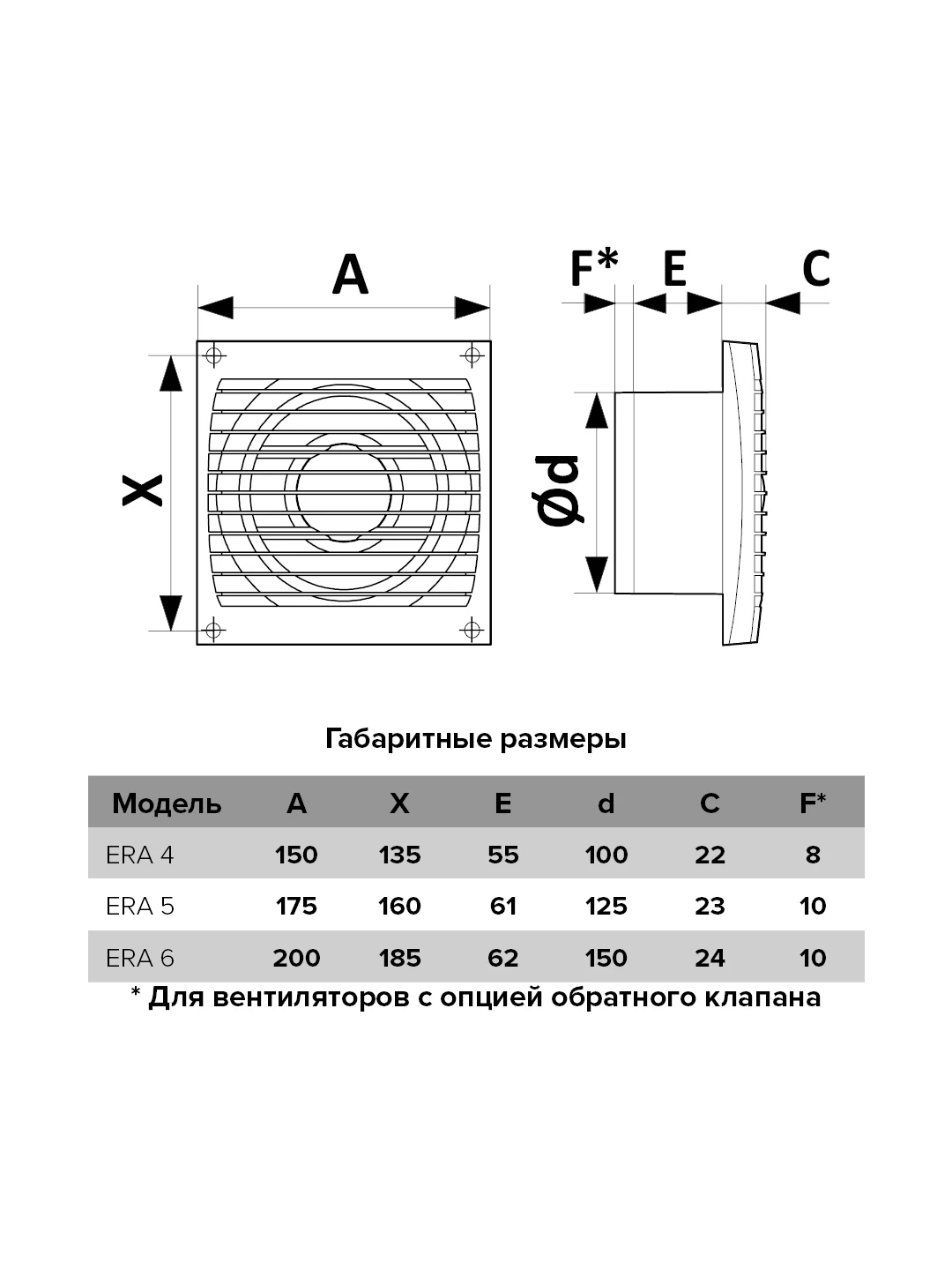 В моделях с опцией С идет слюдовой обратный клапан BV. В остальных его можно установить, для ERA4 и ERA5 также подходит клапан ОК (в этом случае BV или ОК приобретается отдельно).Помимо обратного клапана вентиляторы серии ERA имеют широкий выбор опций: антимоскитная сетка, тяговый выключатель, таймер, фототаймер, датчик влажности. Помимо этого, у ERA4 и ERA5 есть световая индикация. Поэтому в серии ERA каждый может найти себе модель по потребностям.Для постоянной или периодической вытяжной вентиляции санузлов, душевых, кухонь и других бытовых помещений.Крепление к месту монтажа осуществляется при помощи шурупов.Лицевая панель моделей ERA4 и ERA5 оснащена световой индикацией работы вентилятора.Для моделей ERA4 и ERA5 возможна установка клапана серии ОК с пружинным механизмом для защиты от обратной тяги (обратный клапан серии ОК приобретается отдельно).Модели ERA4 и ERA5 имеют широкий выбор опций.Степень защиты оболочки электрооборудования от проникновения твердых предметов и воды — IP24.