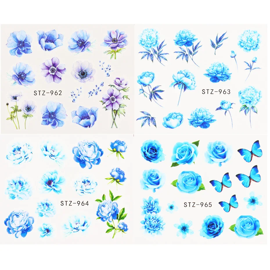 Декоративные лазер-бабочки для дизайна ногтей, акварельные наклейки, слайдеры с синими цветами для ногтей, наклейки для маникюра, Летняя распродажа