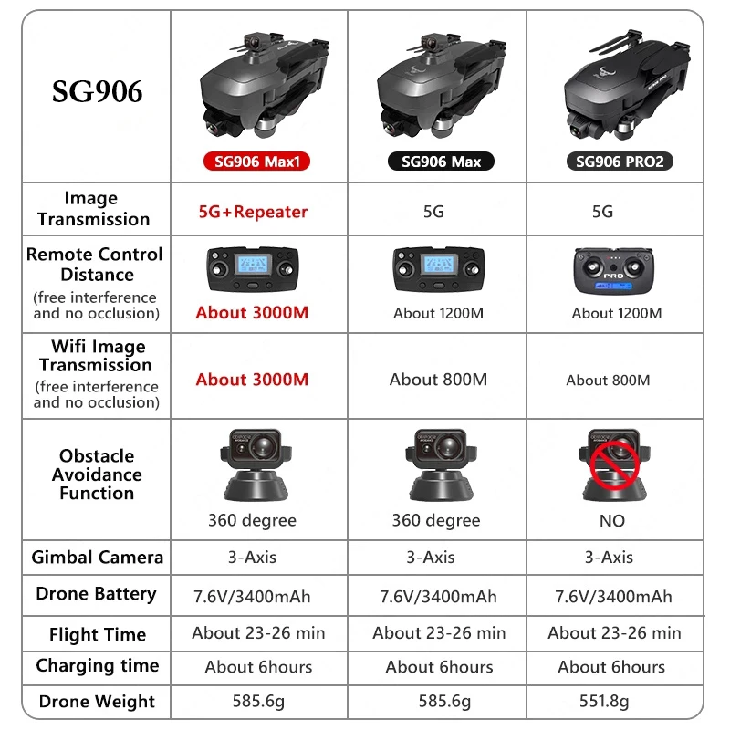 Сравнение параметров SG906 MAX1 SG906MAX и SG906 PRO2 показано на рисунке ниже, пожалуйста, внимательно сравните.