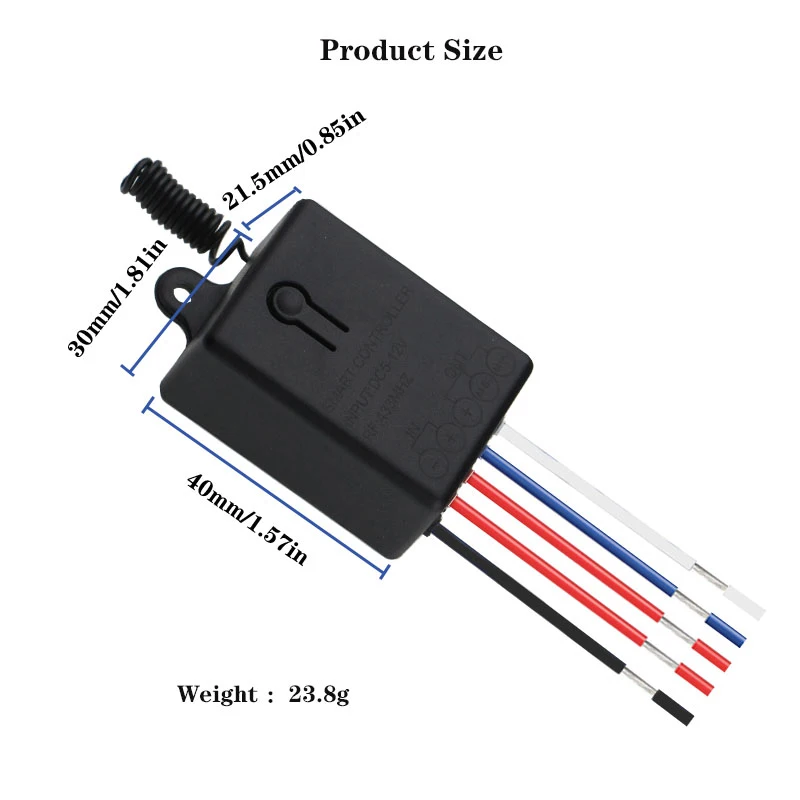 1. Рабочее напряжение: DC5-12V2. Ток покоя: 5 мА3. Рабочая частота: 433 МГц4. Чувствительность приема:-104dBm5. Функция: Мгновенный/тумблер/6. Режим модуляции: ASK7. Режим соответствия: Интеллектуальный код обучения8. Режим выхода: сухой контакт/выходное напряжение9. Корпус: Да10. Рабочая температура: -30 ~ + 7011. Размер (ДхШхВ):40x28,6x21 (мм)