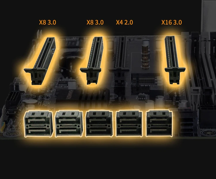 Интерфейсы:2 * RJ45/1 * PS2/6 * SATA3.0/4 * SSATA3.0/4 * USB2.0/2 * USB3.0/1* PCI-E3.0 x16/2 * PCIE3.0 x8/1 * PCIE2.0 x4/1 * X4 3,0 M.2 NVMe/1 * X4 3,0 U.2