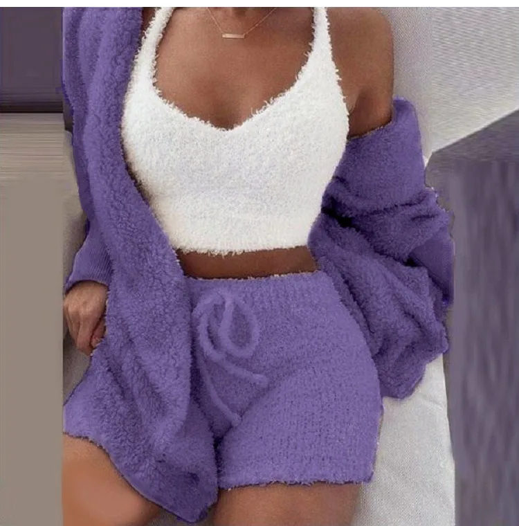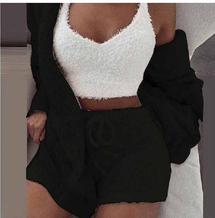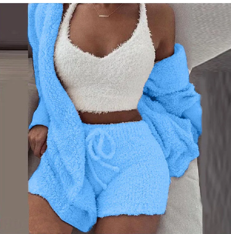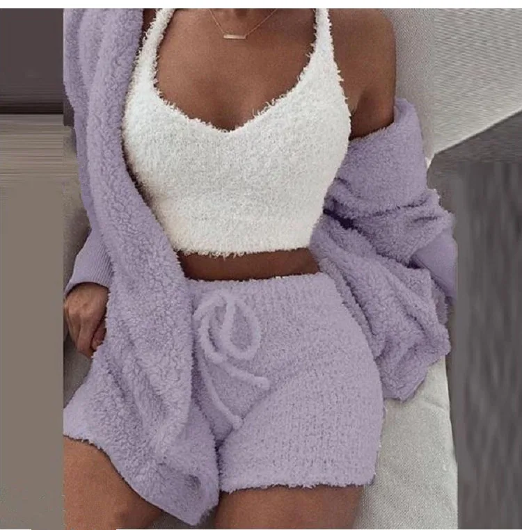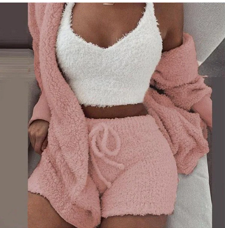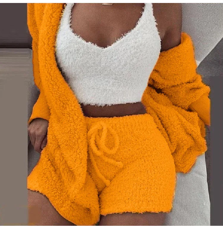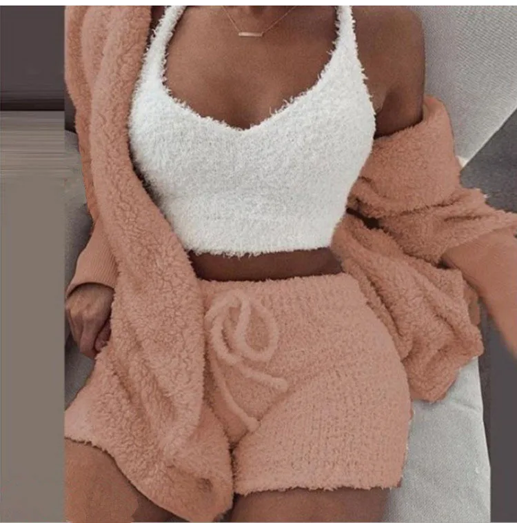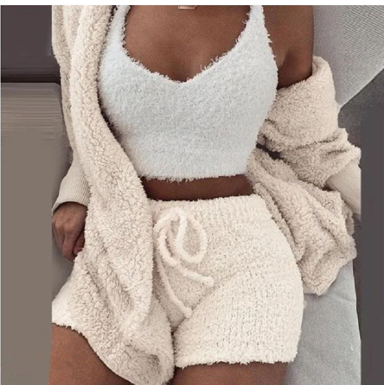 Сексуальные пушистые наряды из трех предметов, плюшевые бархатные аксессуары + шорты + короткий топ, женские спортивные костюмы, повседневные спортивные свитшоты