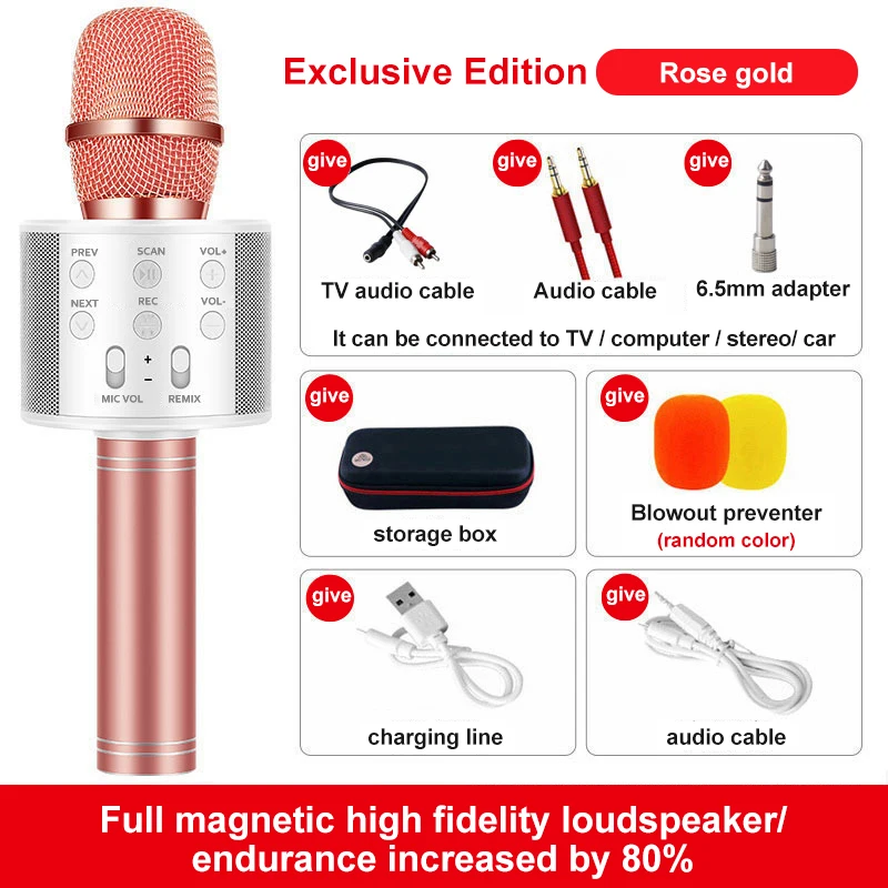 Многофункциональный микрофон-поддержка воспроизведения TF карты, это король K song, это также bluetooth-динамик, HIFI качество звука, подключи и работай, может управлять песнями, В то время как вы тренируетесь дома в одиночестве, как Karao Mike, вы можете почувствовать атмосферу караоке. Если вам нравится песня, вы также можете вставить tf-карту, а затем записать песню. С другой стороны, мы также активны как высококачественный bluetooth-динамик.