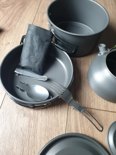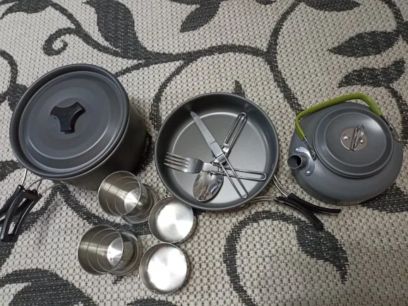 Не плохо! Чайник больше на одну персону, нежели на 2. Размером чайник для чайной церемонии больше подошёл бы, нежили для похода. Но для кемпера достаточно. Крышку для посуды, лучше сделать больше размером, что бы лучше закрывала сковороду. Складные стаканы, на случай если ну вообще нет вариантов, а выпить надо :))) Ибо малейшее давление сверку их схлопнет. Вот прям даже не пытайтесь проверять наполненный стакан. Карабины на них лишены смысла, ибо не паянные звенья, оторваться в лёгкую! Мне как раз пришёл с отстегнутым от стакана карабином :) Карабинчик в комплекте не плохой. Но опять же, алюминий, если только снаружи пристегнуть весь этот набор за чехол. Что опять же, не внушает доверия. В целом, набор не плохой. Но я бы сказал что он на одну персону.