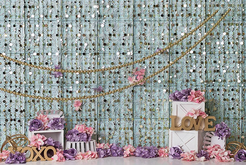 Фон для студийной фотосъемки с голубыми текстурированными серебряными блестками и розовыми цветами 14 февраля Дня Святого Валентина