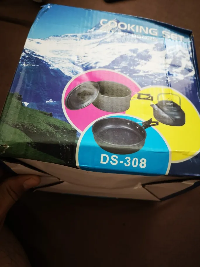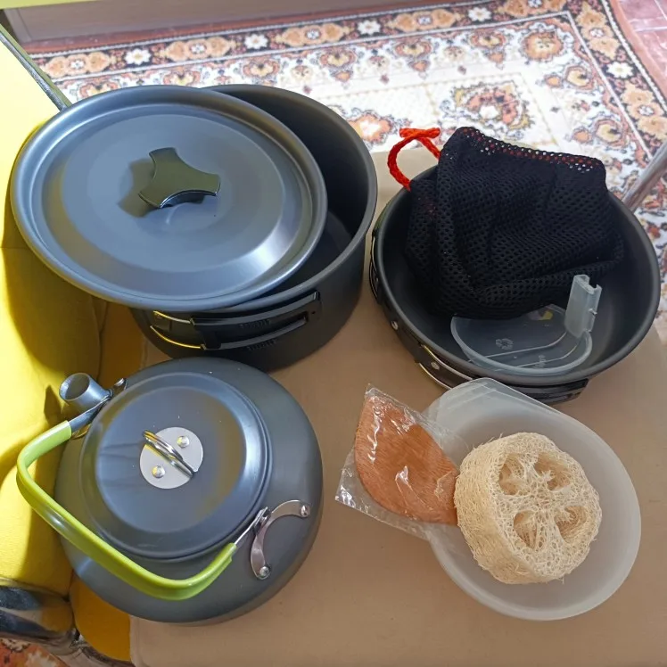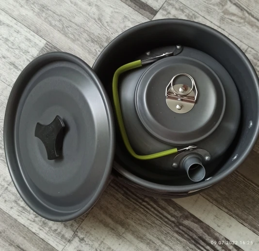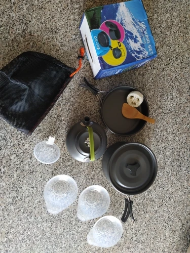 заказ пришел почти вовремя, описанию соответствует. как покажет себя на природе, будет ясно со временем. опробовал дома на портативной газовой плите. все нормально.только прилипает, но терпимо. чайник на 2.5 стандартные кружки. набор подойдёт для одного двух человек на природе.