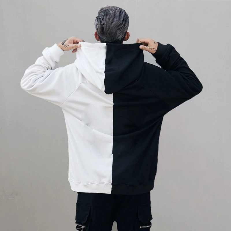 Толстовка мужская оверсайз с длинным рукавом, хлопок, пэчворк, Модный пуловер, двухцветная кофта с капюшоном