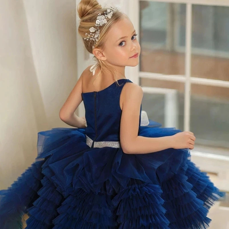 Темно-синее Многоярусное платье на одно плечо для девочек, платье принцессы с цветочным рисунком и бантом, Красочное платье для торжества, дня рождения, Причастия