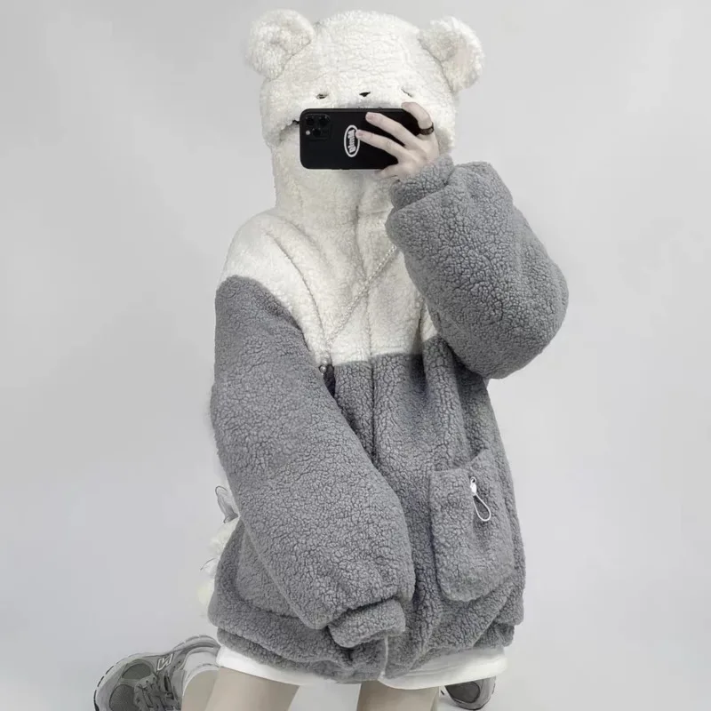 Зимние пушистые толстовки, Женская толстовка с капюшоном с милыми ушками, Милая Вышивка медведя, теплая верхняя одежда на молнии с двумя карманами, флисовая толстовка