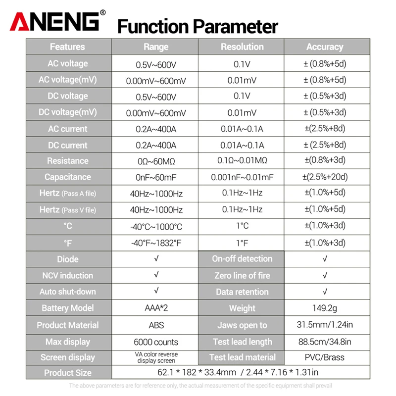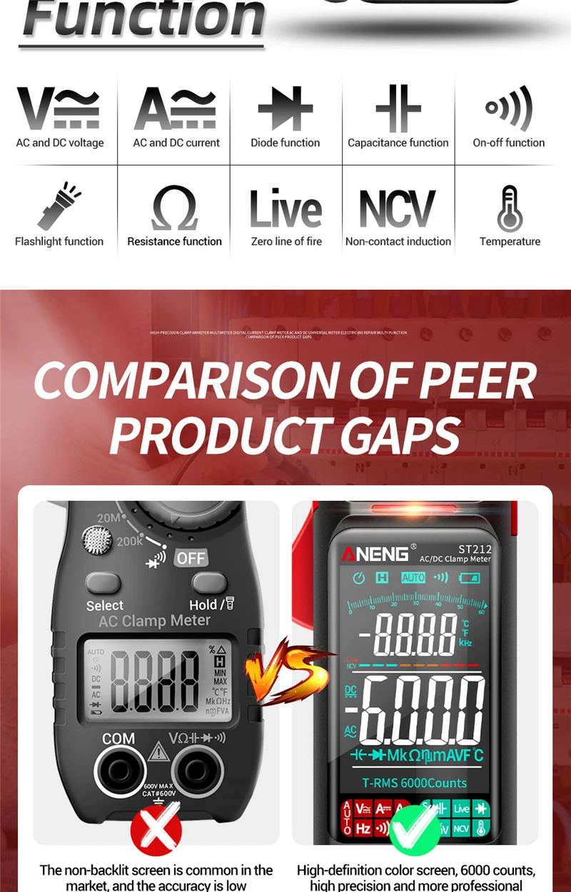 Цифровые клещи ANENG ST212 6000 отсчетов Мультиметр постоянного переменного тока Автоматический диапазон Истинная среднеквадратичная емкость Температурная емкость Тестеры сопротивления NCV