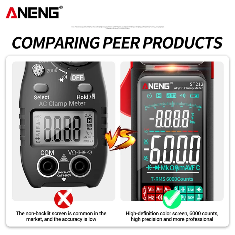 Мультиметр-зажим ANENG ST212 цифровой, 6000 отсчетов, с цветным дис...