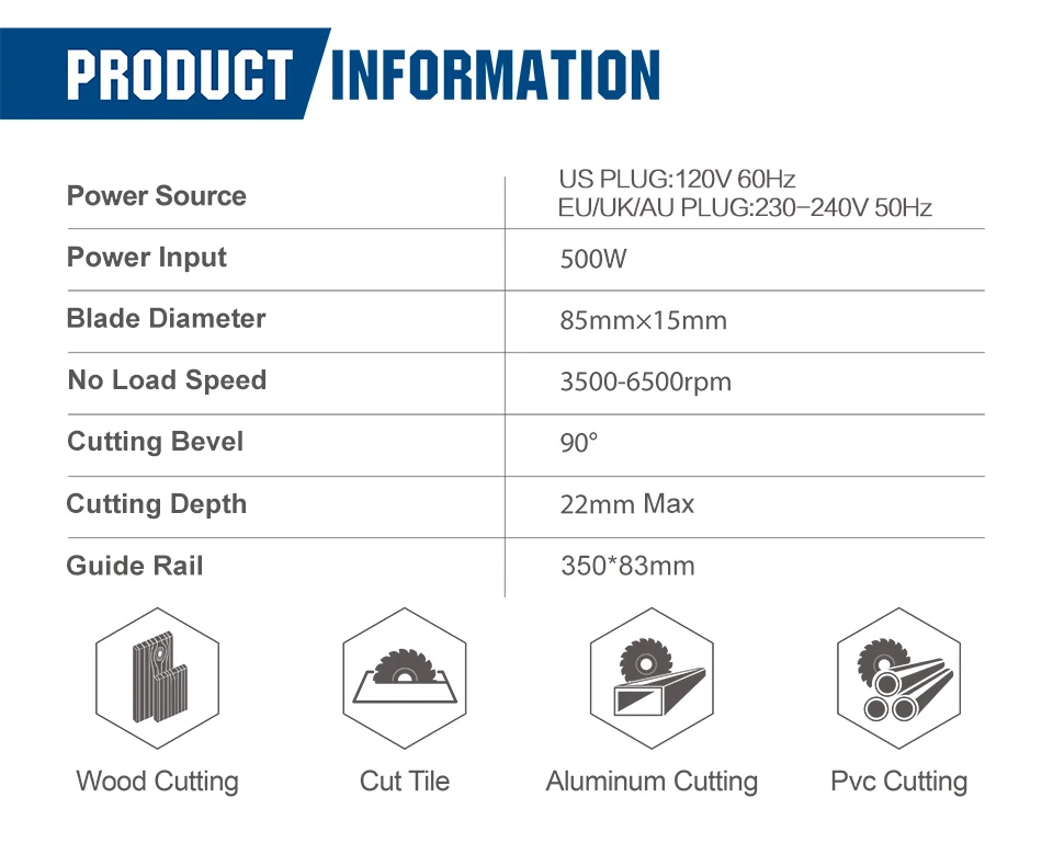 500 Вт электрическая мини-циркулярная пила 120 В 220 В Многофункциональная электрическая направляющая пила 3 лезвия DIY электроинструмент для резки дерева PROSTORMER