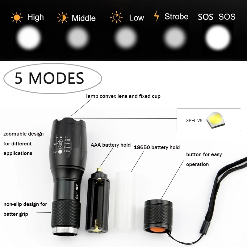 О светодиодный фонарик:Этот Высококачественный водонепроницаемый светодиодный фонарик 80000LM/фонарь с диммером, регулируя телескопическую головку; Кнопка всегда работает в режиме переключения, и вы можете быстро переключаться с полунажатием кнопки.