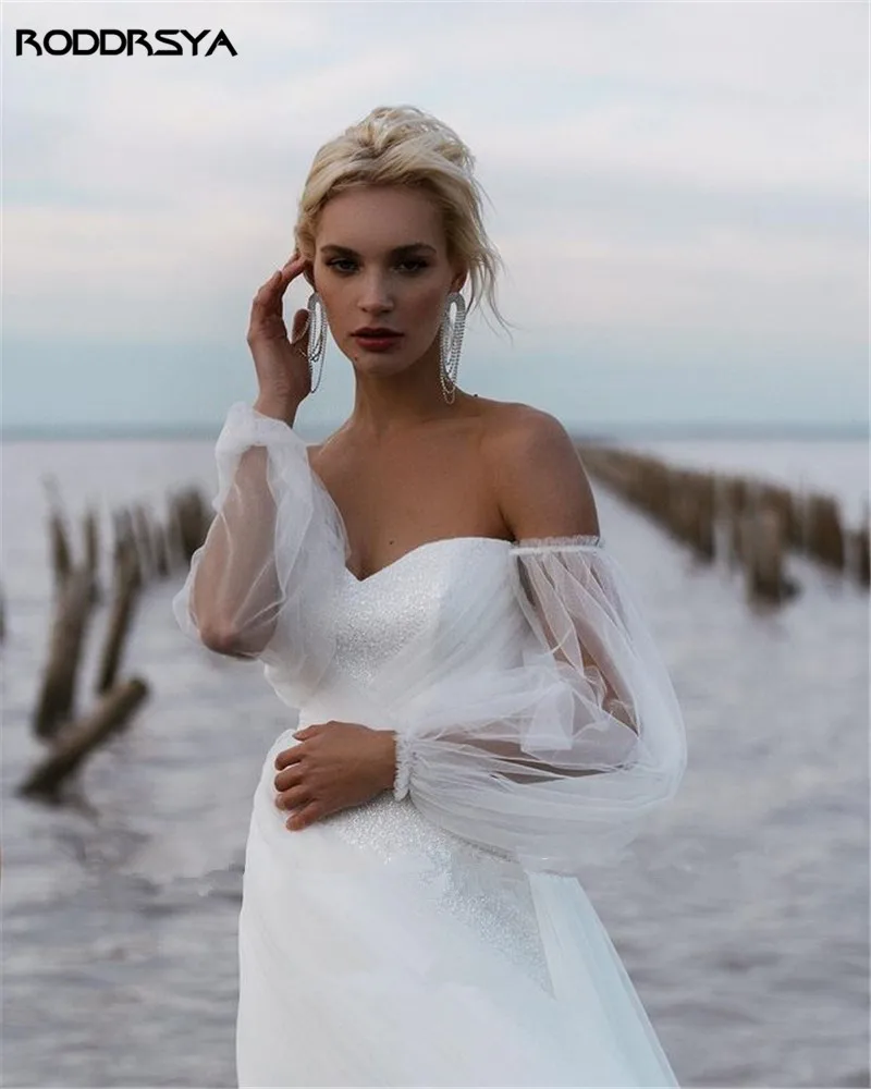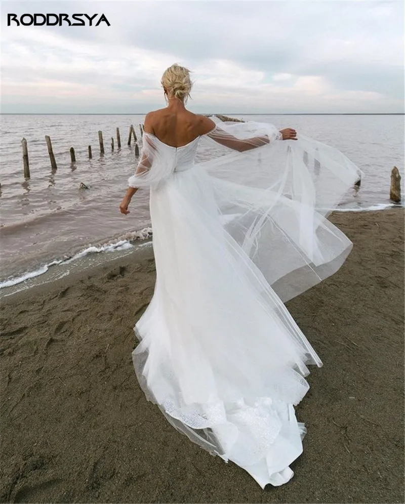 Платье Свадебное блестящее ТРАПЕЦИЕВИДНОЕ из фатина с длинными рукавами-фонариками и открытой спиной