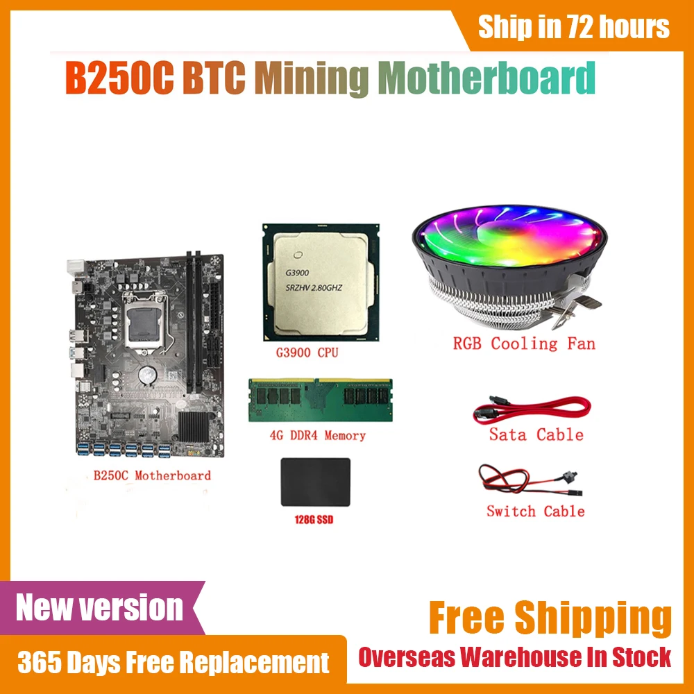 Материнская плата B250C для майнинга + процессор G3930 + вентилятор RGB + DDR4 4 ГБ ОЗУ + SSD 128 ГБ + кабель переключателя + кабель SATA 12 * PCIE в ГПУ слот для карты USB3.0