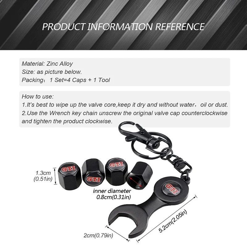 Подходит для VWКоличество: 4 шт./компл.Размеры: Внутренняя Диаметр: 0,31 дюймов (0,8 см)Снаружи Диаметр: 0,43 дюймов (1,1 см)Длина: 0,77 дюйма (1,95 см)Цвет: черный/серебристыйМатериал: сплав из нержавеющей сталиРазмещение наклеек: клапан шины Особенности:• Матовый процесс покрывает поверхность, что делает изделие устойчивым к ржавчине и долговечным.• Пыленепроницаемость, водонепроницаемость и герметичность.• Точные винты, прочные и стабильные.• Защитите и украсьте свой автомобиль. Как использовать:1. Лучше всего протирать сердечник клапана, держать его сухим и без воды, масла или пыли.2. Отвинтите оригинальную крышку клапана против часовой стрелки и затяните изделие по часовой стрелке.