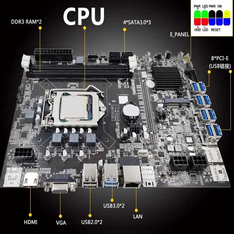 B75 ETH Mining материнская плата LGA1155 8 USB 3,0 для PCIE слот GPU DDR3 двухканальный ПК Настольная материнская плата для горнодобывающей машиныИнтерфейс USB 3.0: Мгновенная скорость передачи данных в 10 раз быстрее, чем USB 2,0 через функцию plug and play.2 * DDR3 DIMM двухканальный слот для памяти, максимальная поддержка памяти 32 Гб, более высокая скорость чтения, значительно повышает производительность материнской платы.Высокая энергия тепловыделения, не боится высокой температуры, сильный дизайн тепловыделения, чтобы обеспечить полную скорость работы процессора.Наша материнская плата имеет стабилизированные конденсаторы, которые могут обеспечить стабильное напряжение для вашего электрического оборудования.Материнская плата B75 mining machine-низкое энергопотребление, низкое тепловыделение, энергосбережение и энергосбережение. Настоящая работа для вас длительная и полезная.