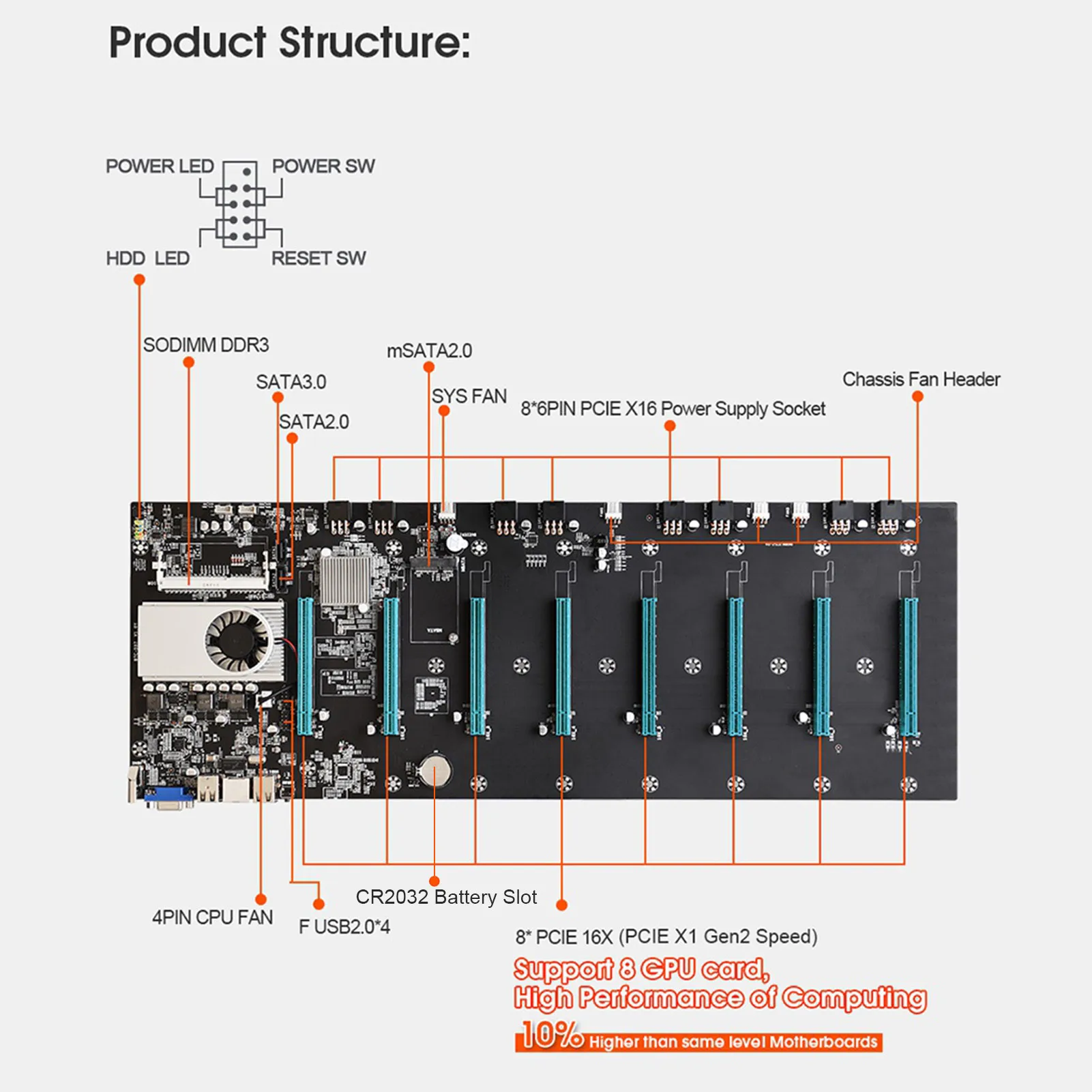 Семейная материнская плата для майнинга, комплект ЦП с низким энергопотреблением, 8 * PCIE 16X, поддержка памяти SODIMM DDR3, Встроенная VGA