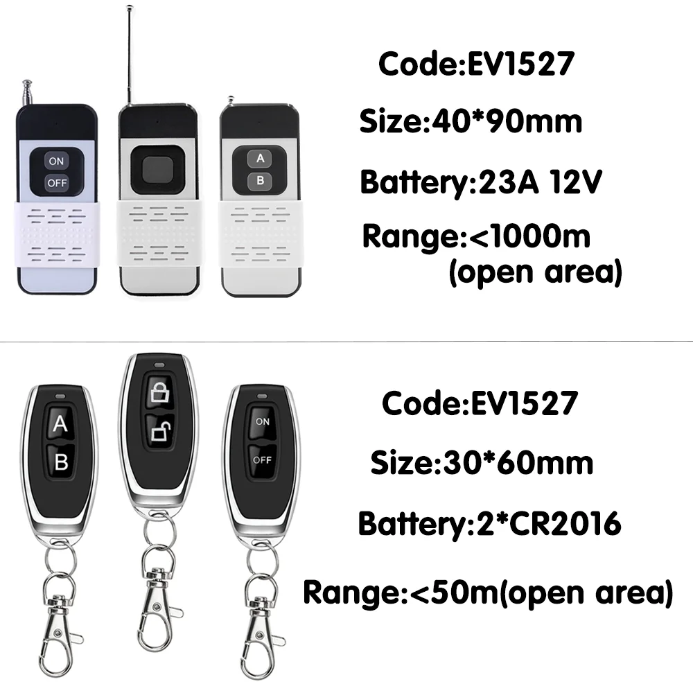 Режимы работы: 4 режима Мгновенный режим, режим переключения, режим блокировки и режим задержки времени Мгновенный режим: Нажмите и удерживайте кнопку, будет работать; Отпустите кнопку, остановится. Режим переключения: Нажмите кнопку, будет работать; Нажмите кнопку снова, остановится;Нажмите кнопку B, будет работать; Нажмите кнопку B снова, остановится. Режим блокировки: Нажмите кнопку, будет работать; Нажмите кнопку B снова, остановится. Режим задержки времени: Нажмите и удерживайте кнопку «A», включите;Отпустите кнопку, выключите через 5 секунд (или 10/15 секунд) Как программироватьМгновенный режим: Нажмите кнопку обучения один раз, нажмите кнопку один раз, добиться успеха.Режим переключения: Нажмите кнопку обучения дважды, нажмите кнопку один раз, нажмите кнопку B, добиться успеха.Режим блокировки: Нажмите кнопку обучения 3 раза, нажмите кнопку один раз; Нажмите кнопку B один раз. Добиться успеха.Режим задержки времени: Нажмите кнопку обучения 4/5/6 раз, нажмите кнопку один раз, добиться успеха. Сброс: 8 раз нажмите кнопку обучения. Существующие данные будут удалены успешно.