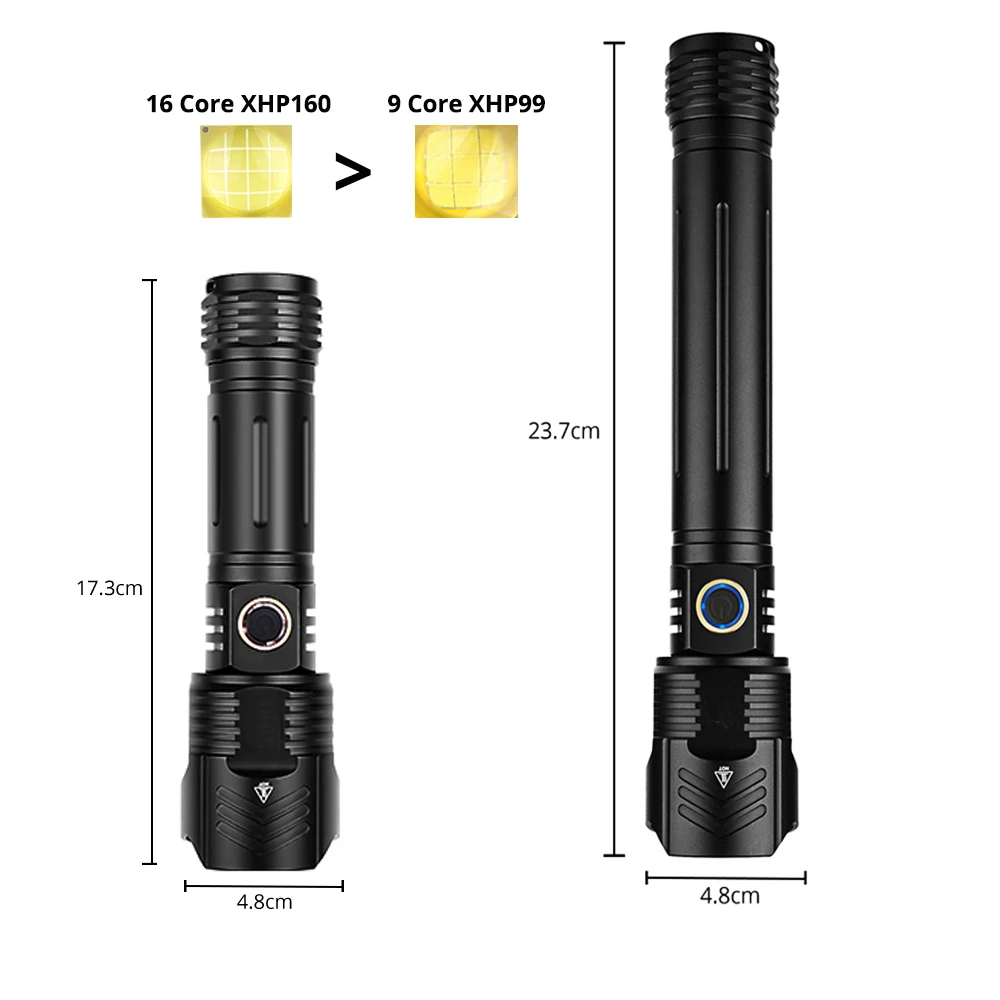 1. Оснащен лампами серии XHP, яркость одной лампы XHP больше 4 лампочек T6.