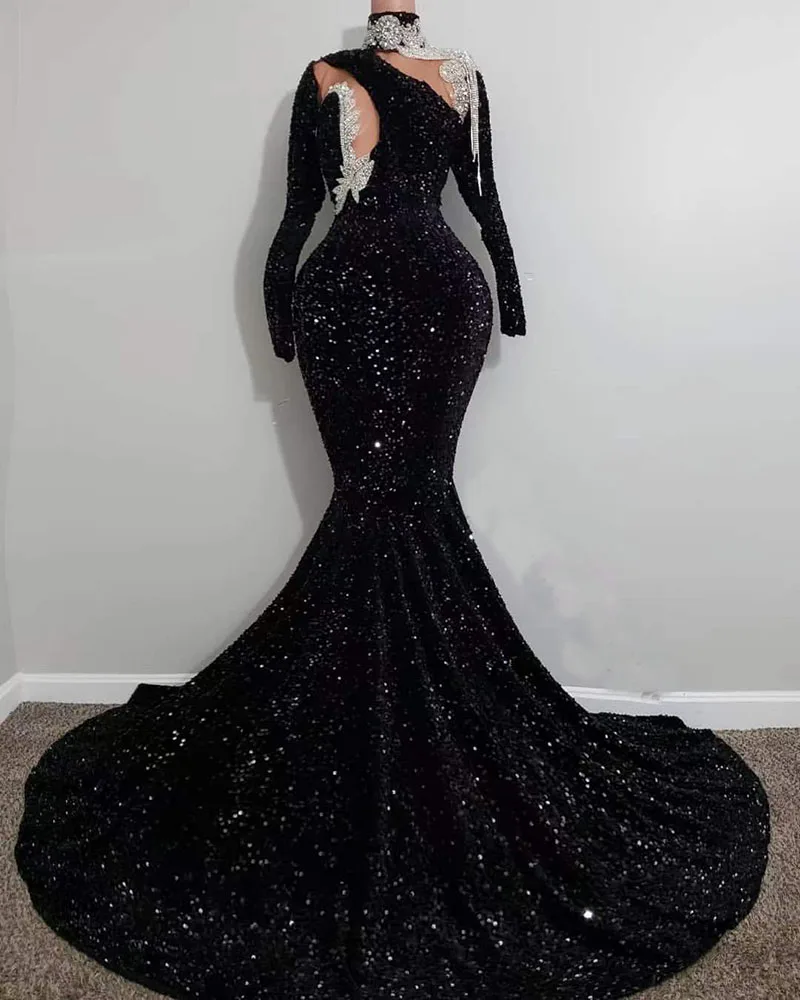 Черные платья русалки для выпускного вечера, блестящие черные вечерние платья с длинным рукавом для девушек в африканском стиле знаменитостей