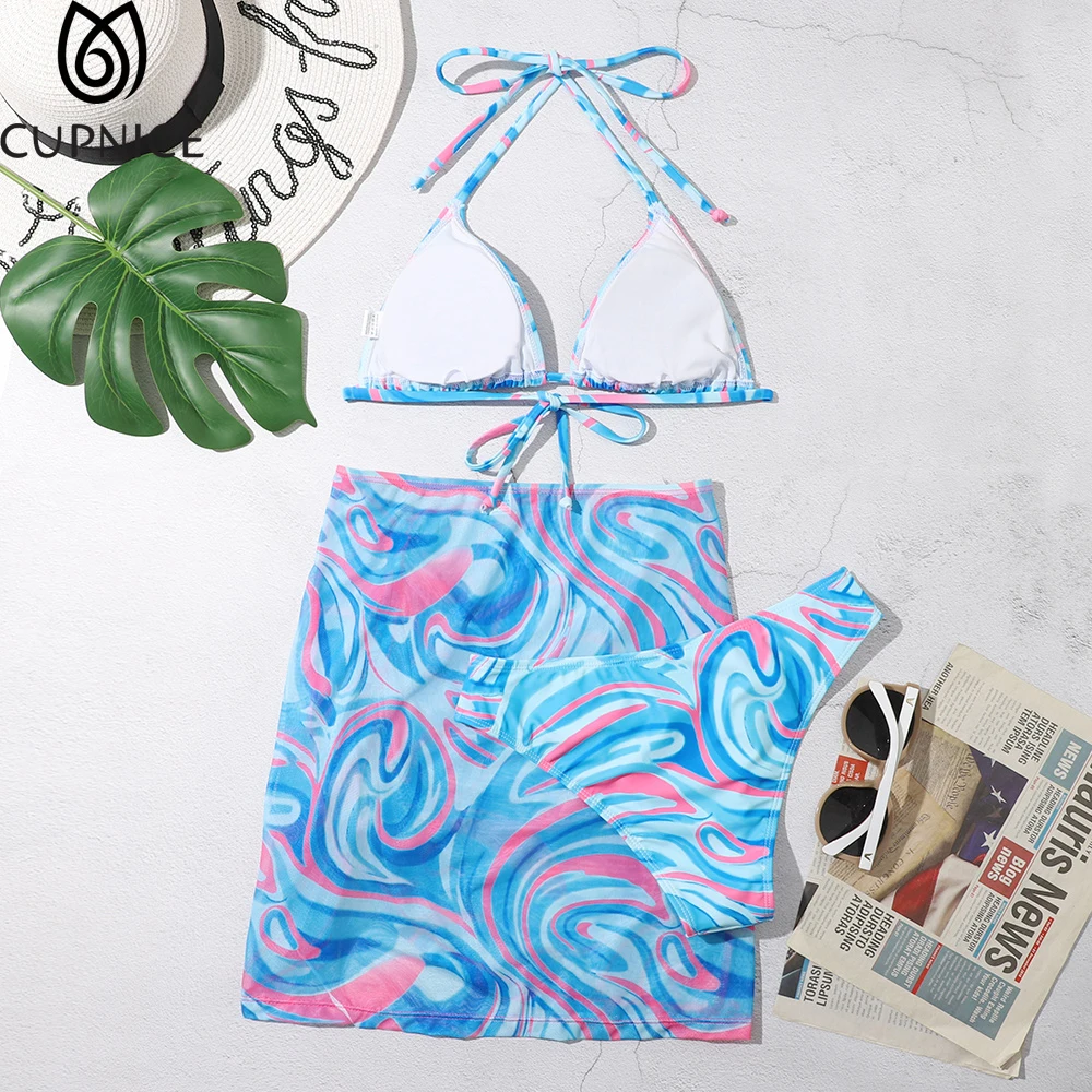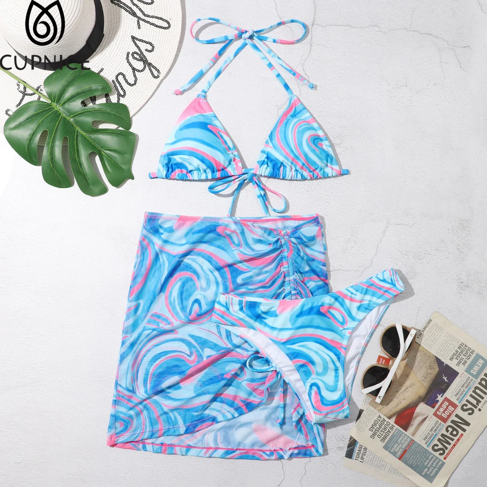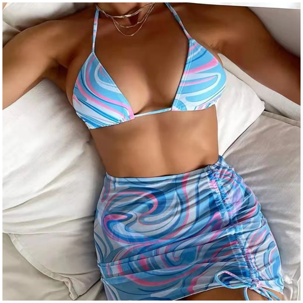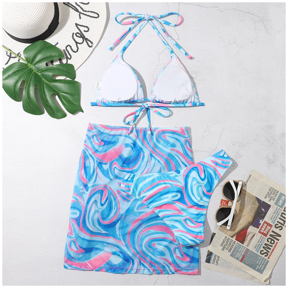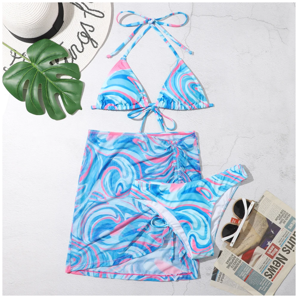Комплект бикини с юбкой женский треугольный купальник с бретелькой через шею, 3 предмета, синий абстрактный купальник с принтом в виде вихрей, сетчатый купальник с рюшами