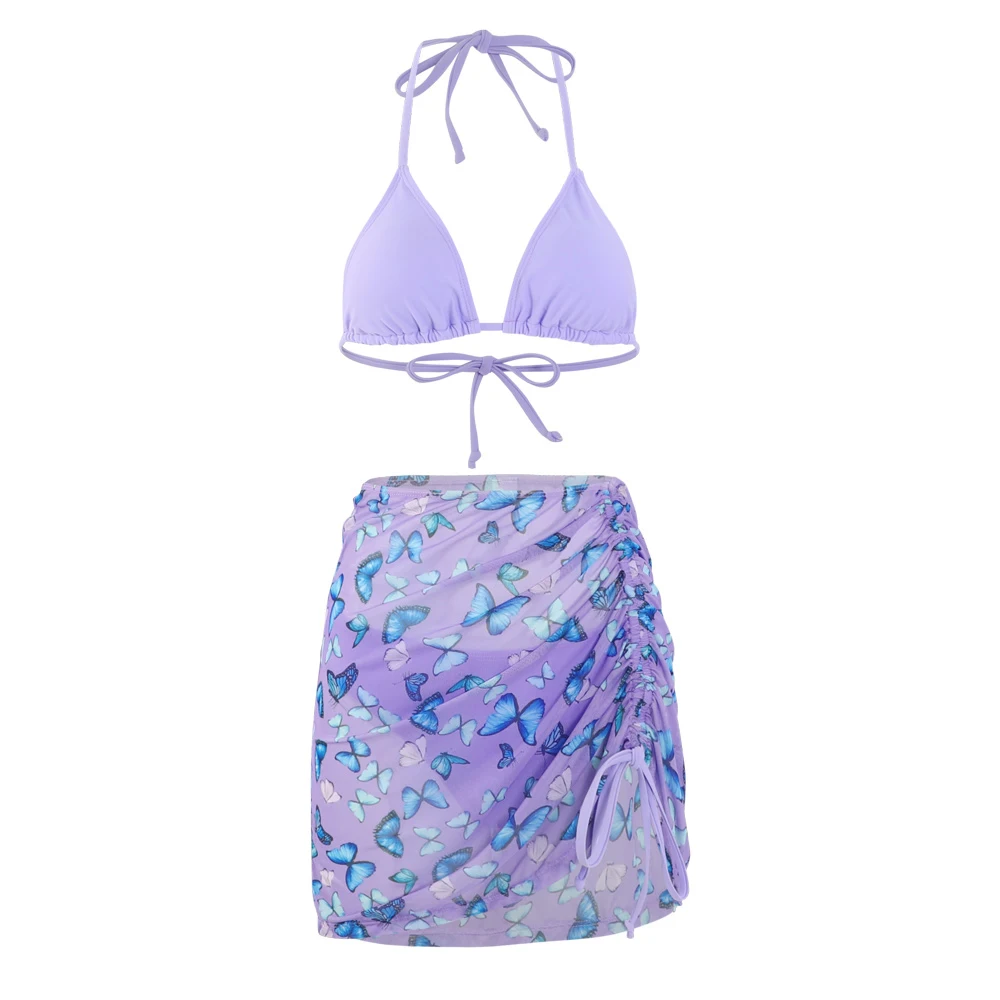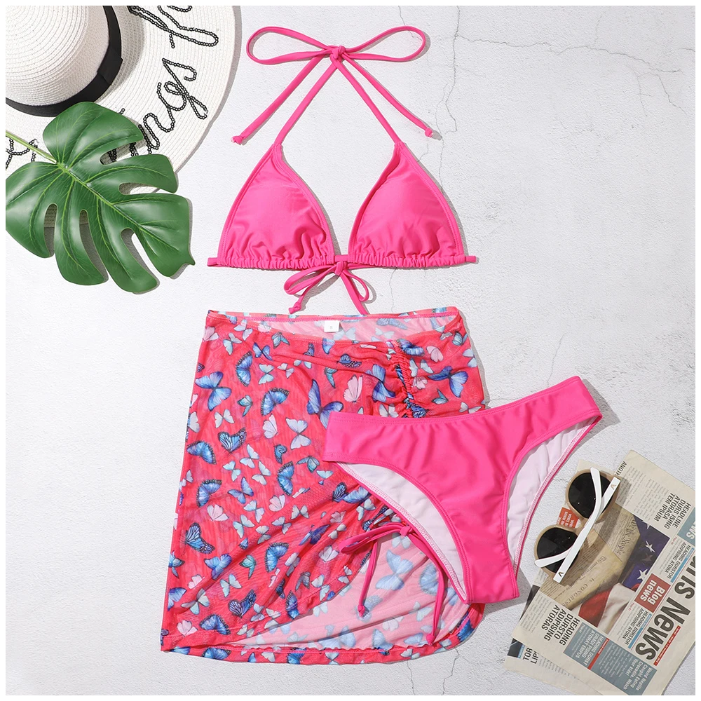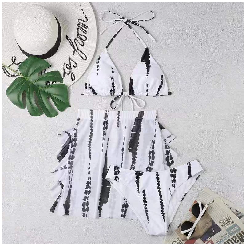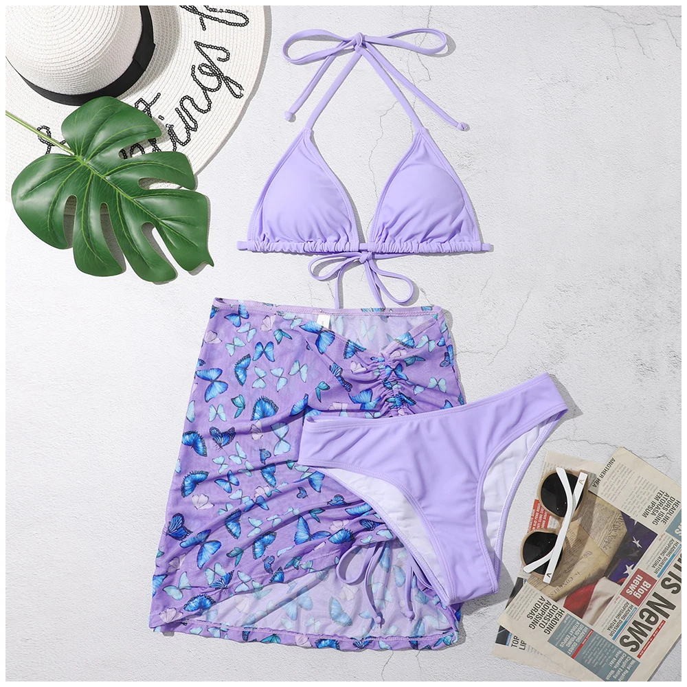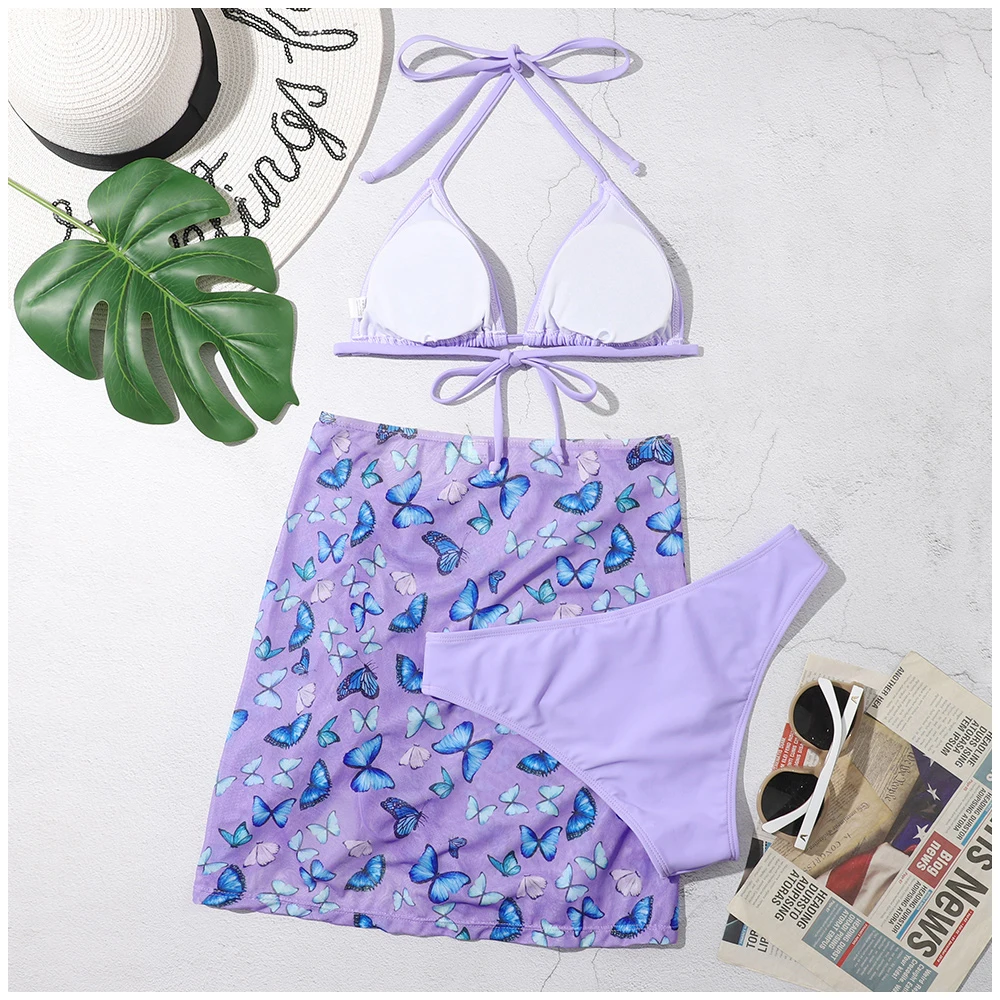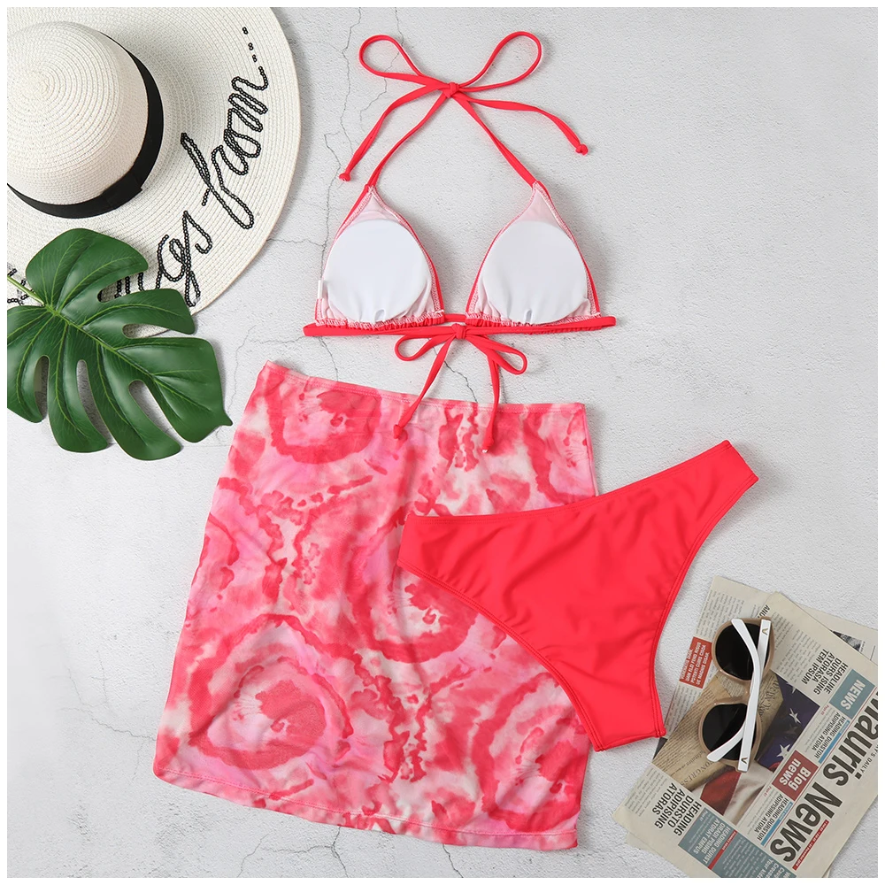 Комплект бикини с юбкой, комплект для плавания из 3 предметов, треугольная лямка через шею, на шнуровке, купальник с кружевным принтом, сетчатый купальник с оборками и боковым поясом