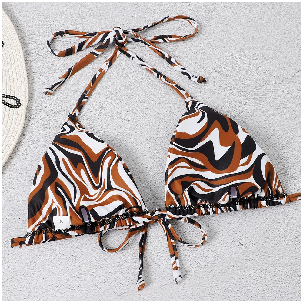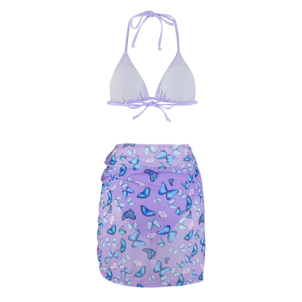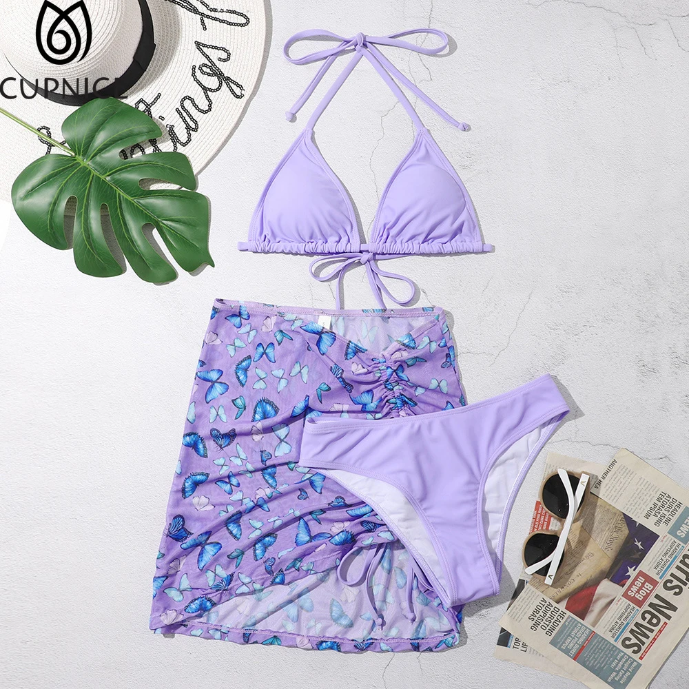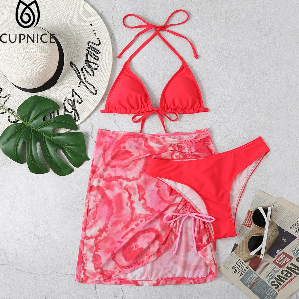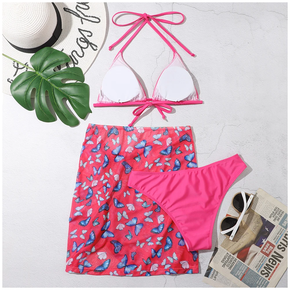 Комплект бикини с юбкой, комплект для плавания из 3 предметов, треугольная лямка через шею, на шнуровке, купальник с кружевным принтом, сетчатый купальник с оборками и боковым поясом