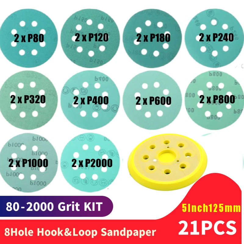 21 шт.компл. 5 дюймов 125 мм 8 отверстий от 80 до 2000 Grits крючок и петля полиэфирная пленка шлифование наждачной бумагой диск абразивные полировальные инструменты